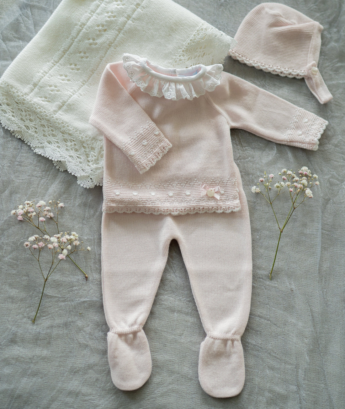 Lace Petals Knit Baby Set – 3-Piece Sweet Ensemble #C8001