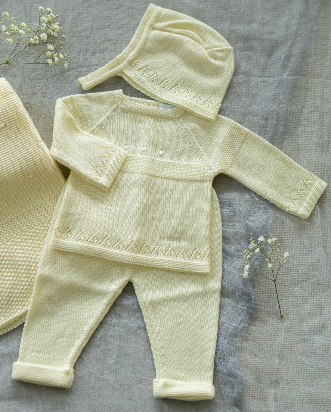 Calado Three Piece Knitted Outfit for Newborns – 100% Organic Cotton (Available in 5 Colors)