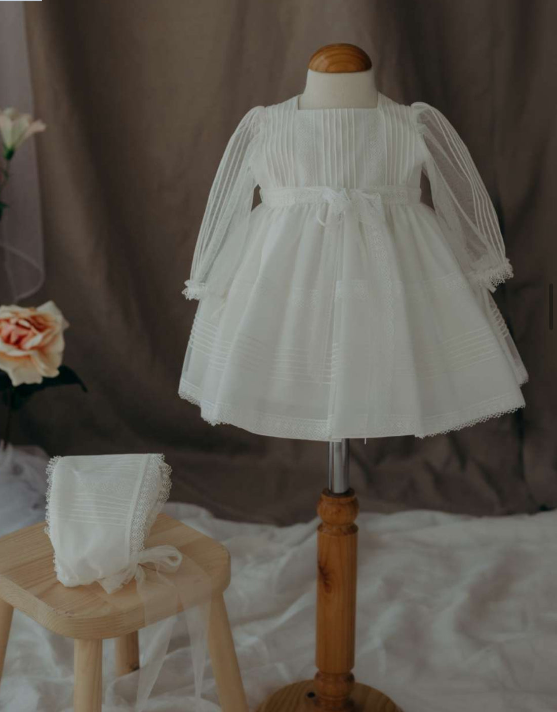 This off-white baby girl baptism dress (Style #5930) is crafted from premium organza and tulle, featuring...