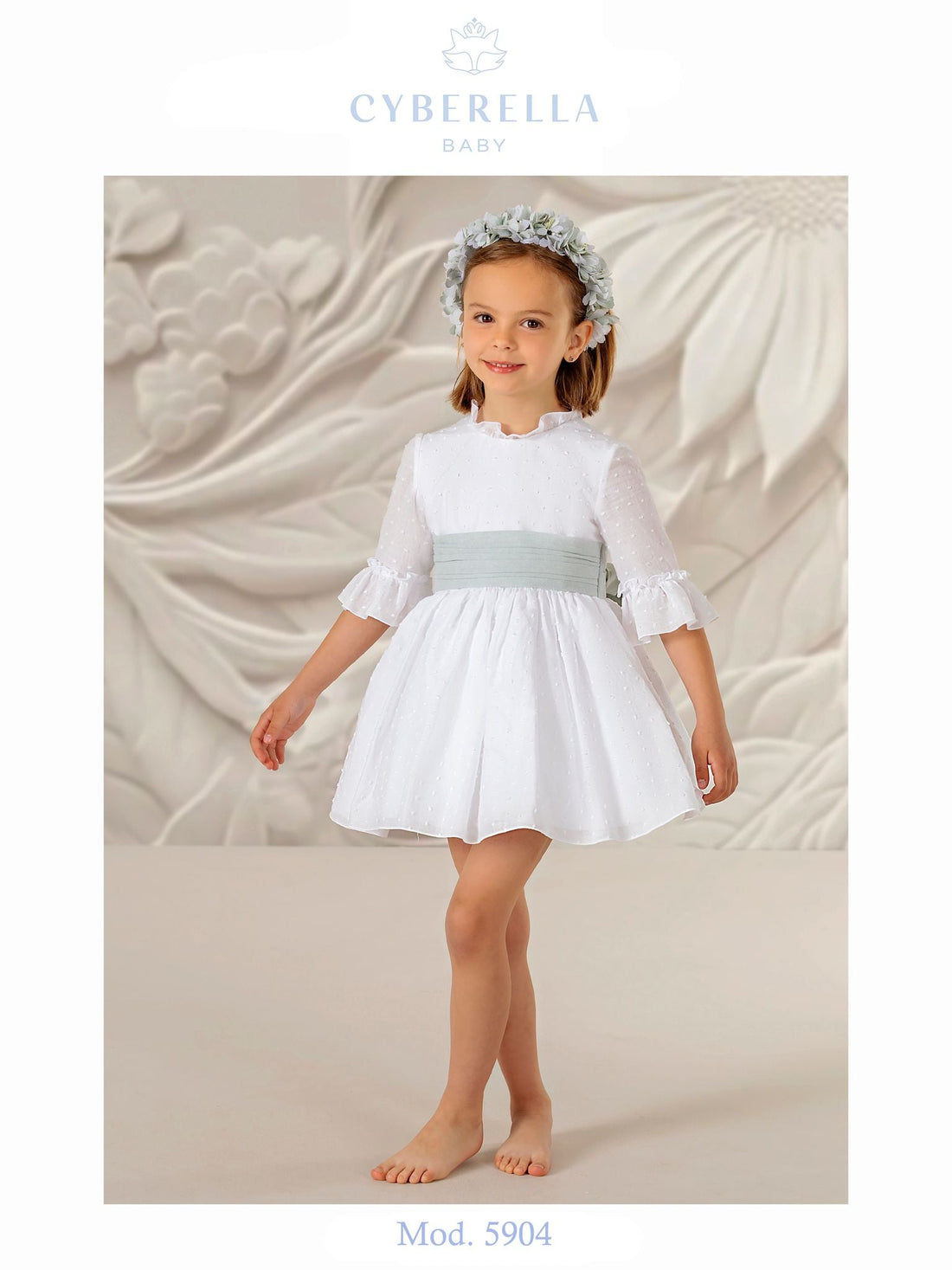 Elegant White Ceremony Dress with polka Dots and Green Sash – 5904