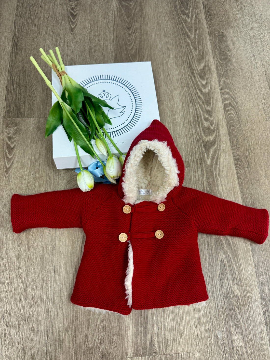 Red Knit Baby Jacket with Fleece Hood and Wooden Buttons