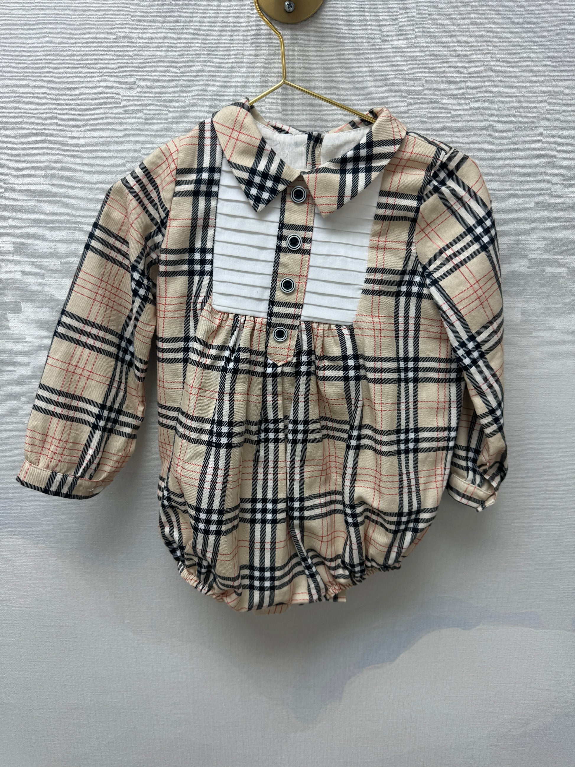 A timeless piece for your little one, this baby romper features a classic beige plaid pattern with soft red and black tones. The front is designed with a crisp white tuxedo-style panel, pleated details, and decorative buttons for a dressed-up look with everyday comfort. Complete with a pointed collar and elastic leg openings for easy movement.