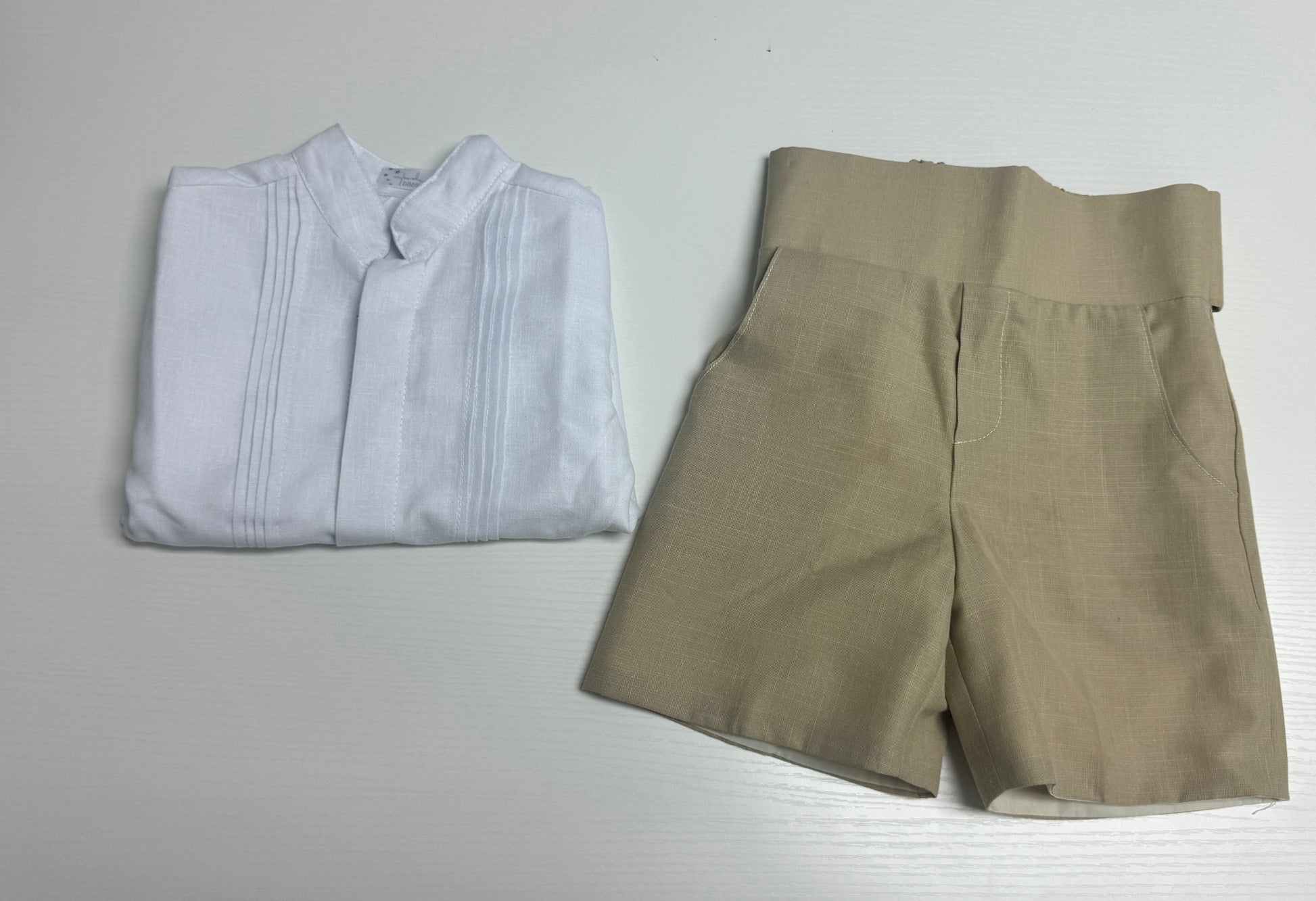 Let your baby boy shine in this beautifully tailored outfit from Cyberella Baby. The ensemble pairs a refined white pintuck shirt with high-waisted ivory linen shorts, creating a timeless look perfect for special celebrations. Designed with elegance and comfort in mind, the soft, breathable fabrics allow for easy movement while maintaining a polished, classic appearance. Whether it’s a wedding, christening, or a family photoshoot, this outfit is made for unforgettable moments.