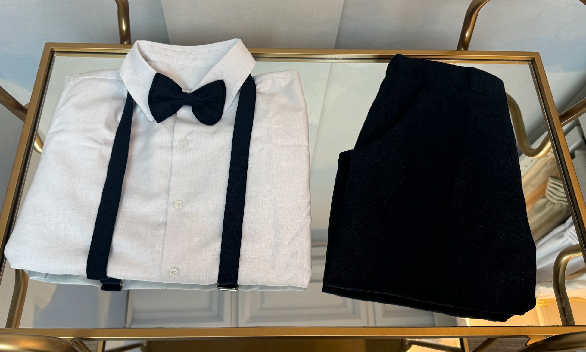 A timeless and elegant outfit for boys, this three-piece linen set is perfect for weddings, birthdays, and special occasions. The ensemble includes a crisp white long-sleeve linen shirt, tailored navy trousers, coordinating suspenders, and a matching navy bow tie. Made in Spain with premium natural fabrics, this look offers comfort, style, and classic European charm.
