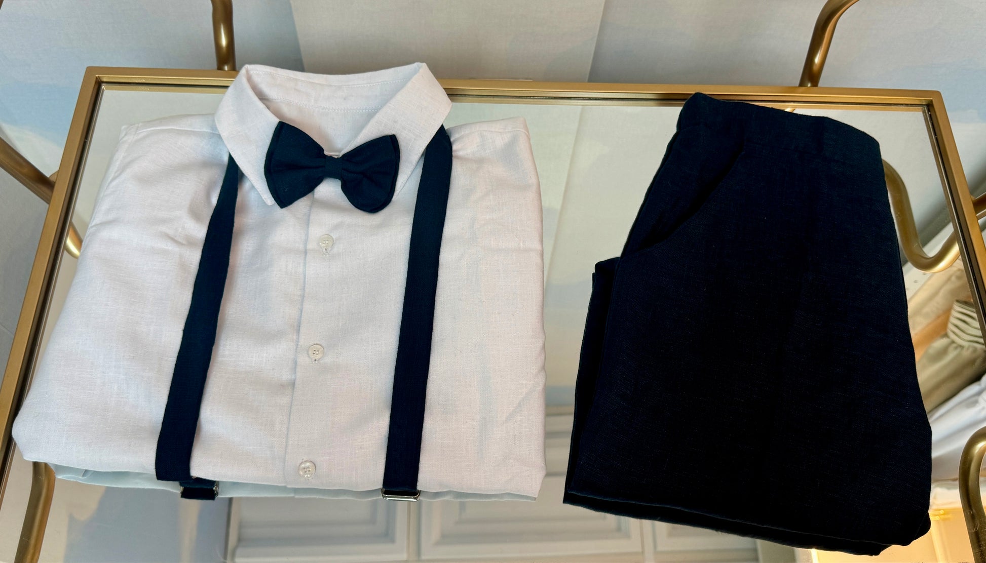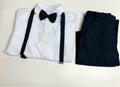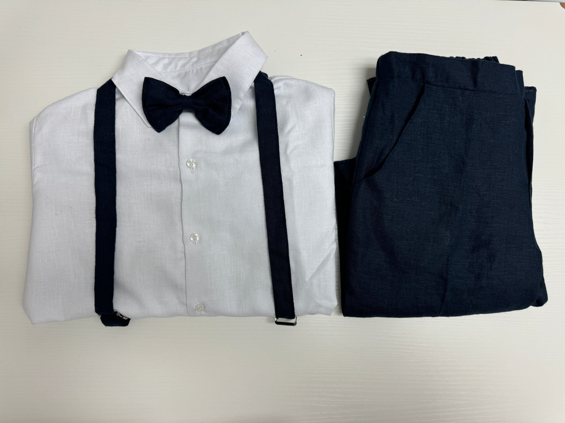 Classic Navy Linen Suspender Set with White Shirt and Bow Tie