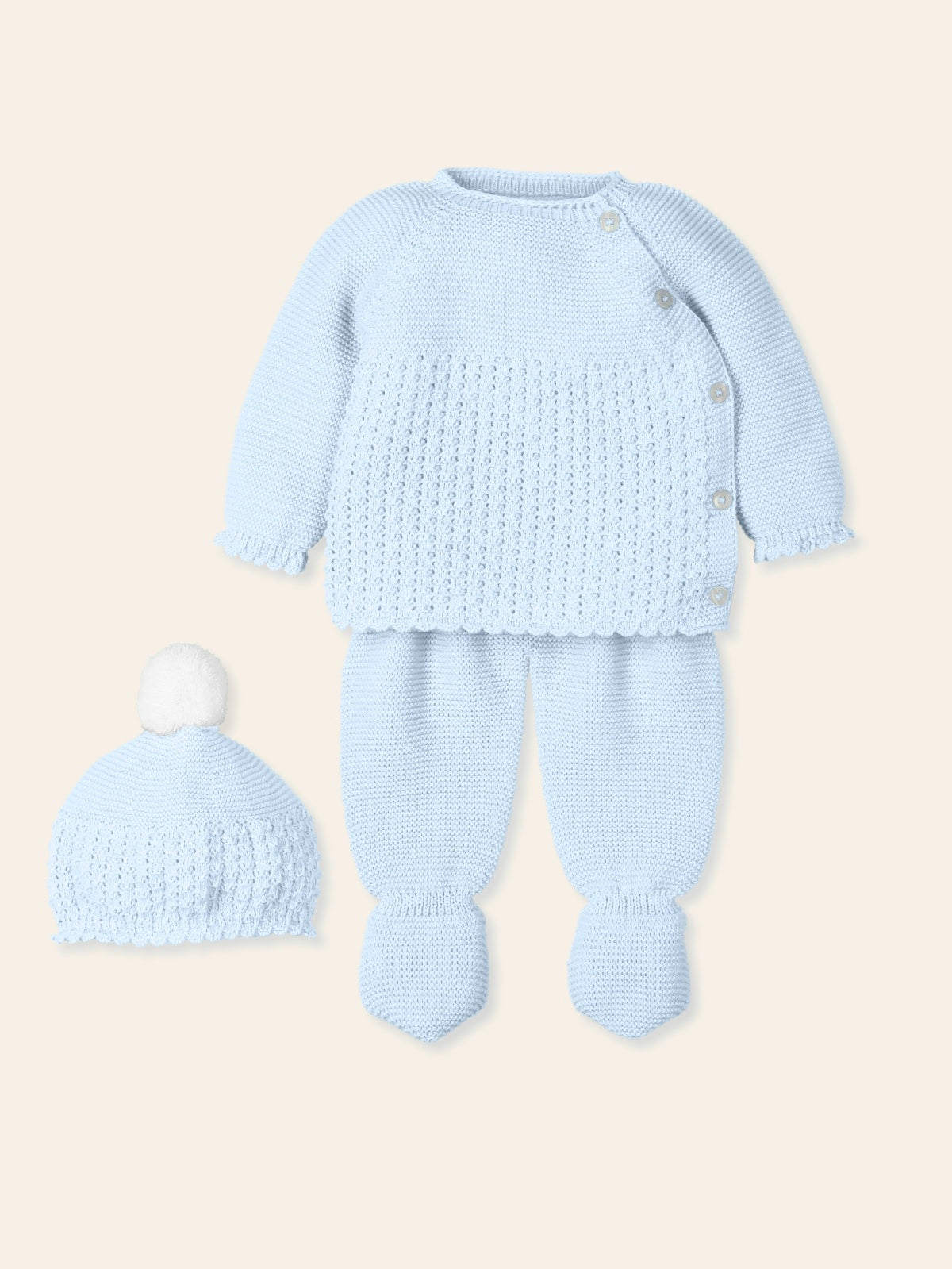 • Blue Knitted Set: Includes a soft sweater, footed pants, and a matching hat for a complete and adorable outfit.