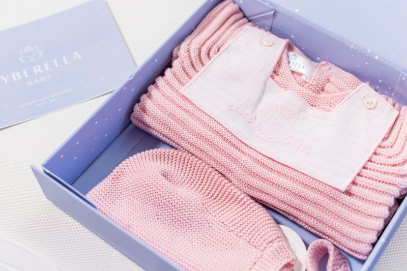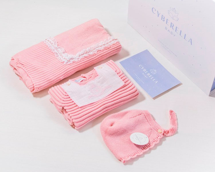 Includes beautiful organic cotton knitted blanket with embroidered ribbon details