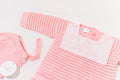 Beautiful Old Pink one-piece knitted romper in organic cotton with removable linen bib. Handmade in Spain.