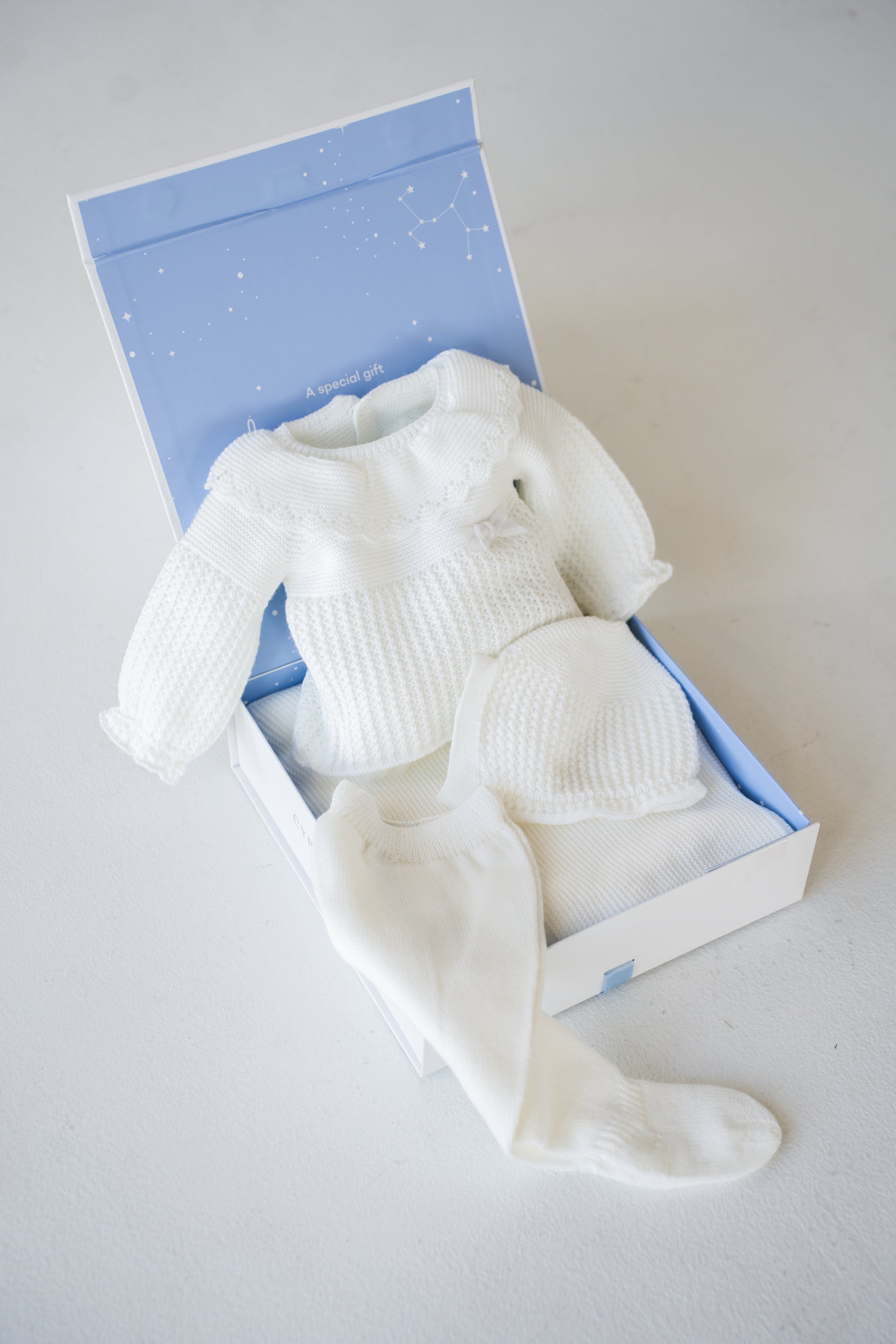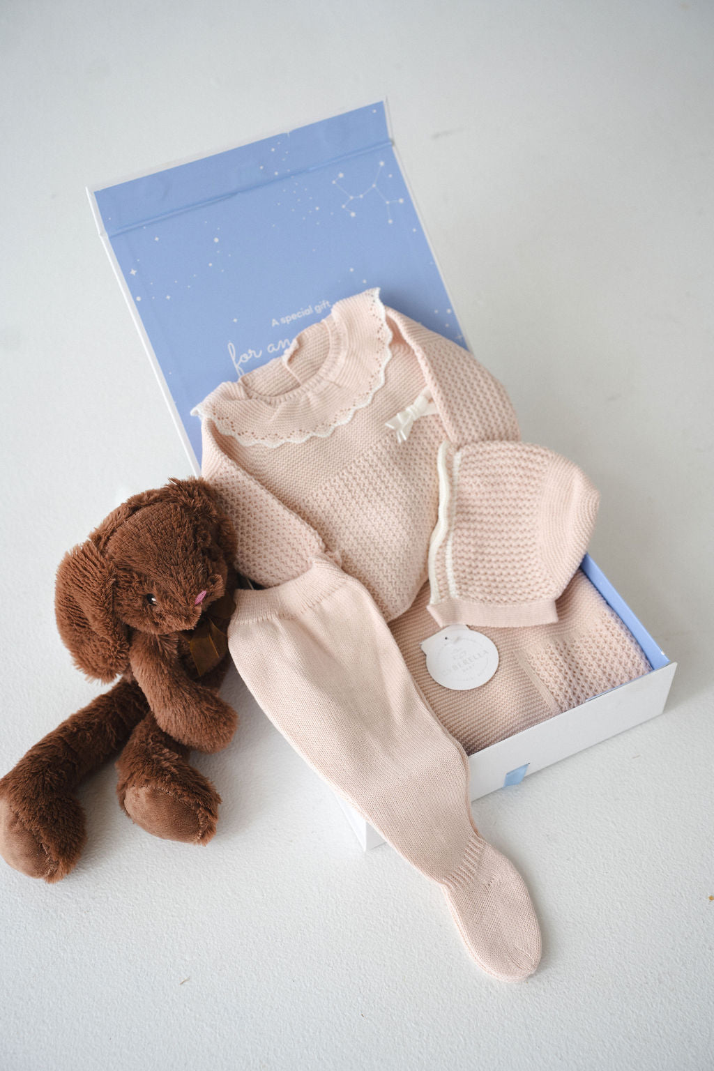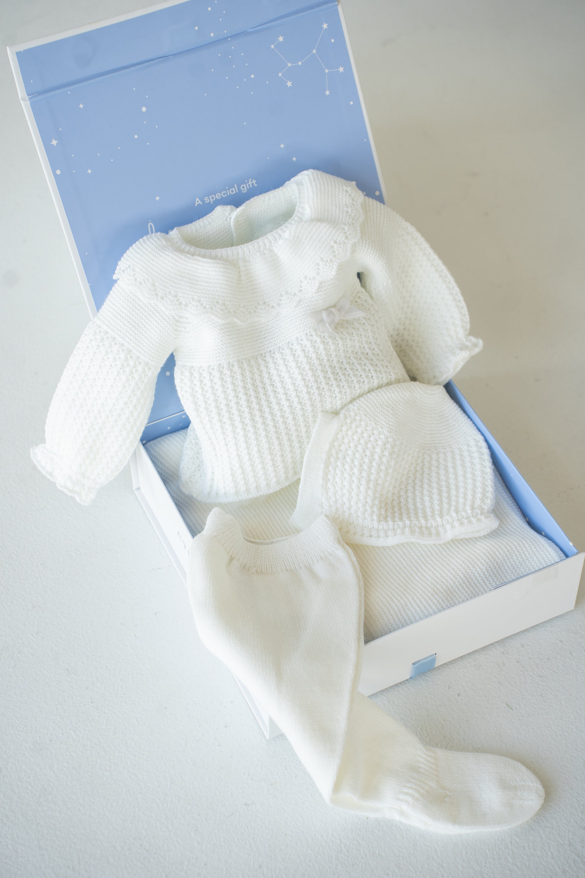 The Dreamy Powder Knit Baby Set provides a soft, tender feel that’s gentle on a newborn’s sensitive skin. This sweet outfit combines comfort and cuteness, featuring a snug sweater with coordinating pants, a charming bonnet, and a cozy blanket to keep your little one warm and comfortable.