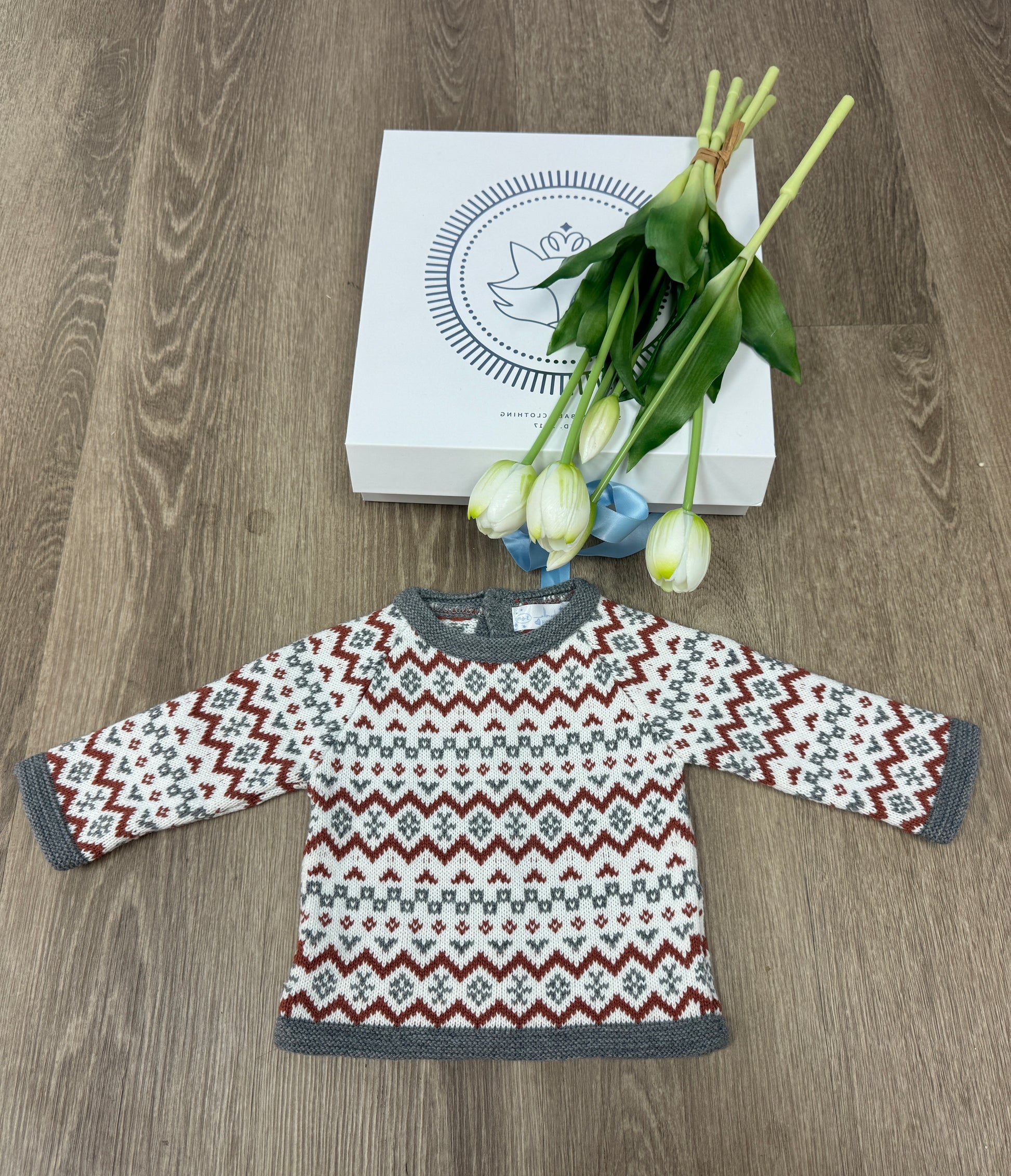 Elevate your baby's everyday style with this elegant dusty red, grey and white knit sweater. Featuring a soft, muted color palette and classic design, it’s perfect for layering on chilly days while keeping your little one comfy and stylish. Made in Spain with attention to detail and premium materials.