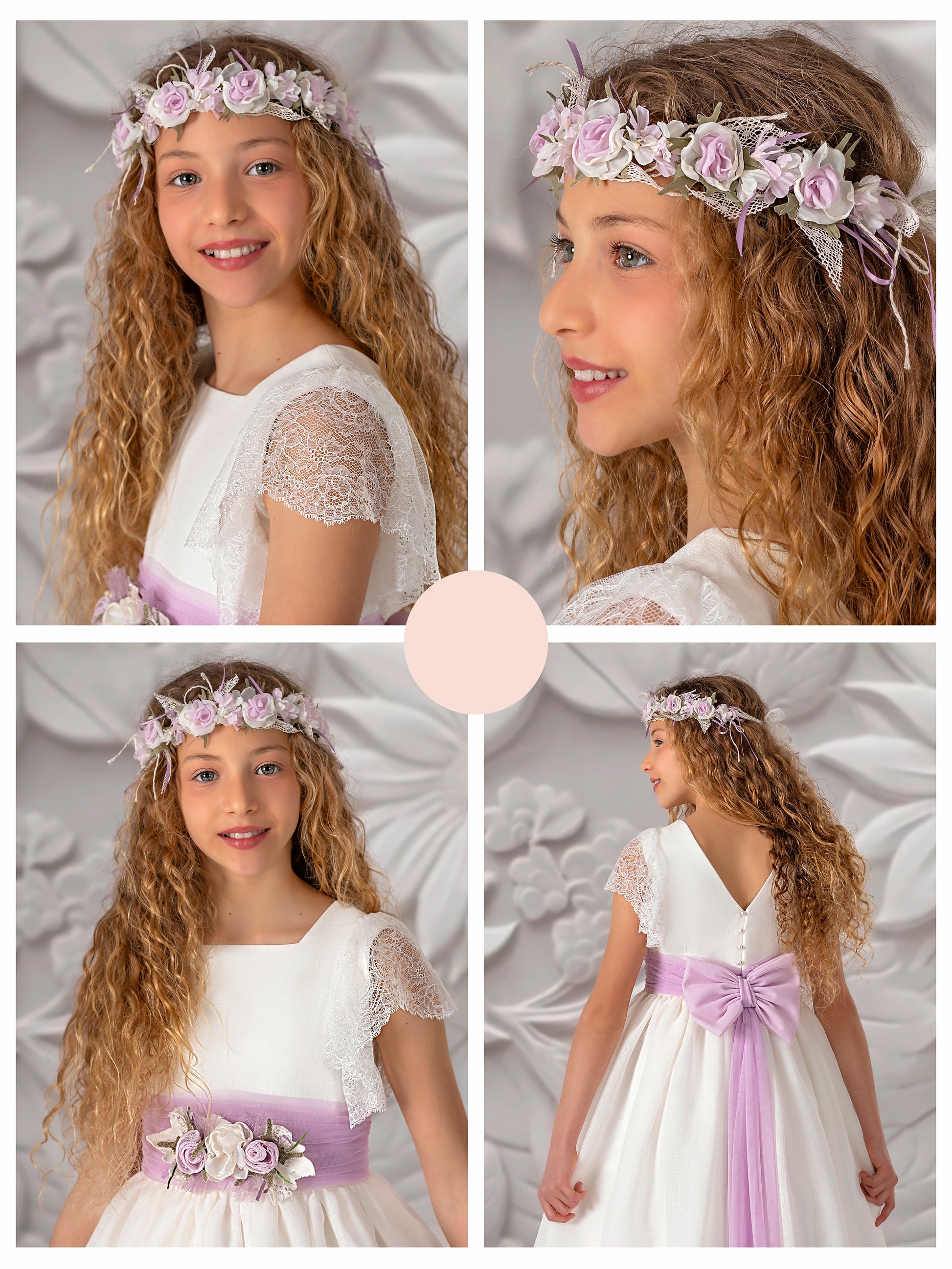 Introducing First Communion Dress Model 5806 , a stunning fantasy piece made from illusion chiffon in a delicate light ivory color, adorned with charming purple details. This dress is perfect for making your little girl’s special day magical and unforgettable.