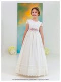 This exquisite custom-made First Communion dress is crafted in soft ivory tulle and finished with intricate embroidered lace along the hem. The dress features a refined short sleeve with floral embroidered lace and a delicate scalloped neckline that adds timeless charm. At the waist, a wide lilac sash is adorned with handmade floral appliqués and tied into an elegant bow at the back for a romantic touch.
