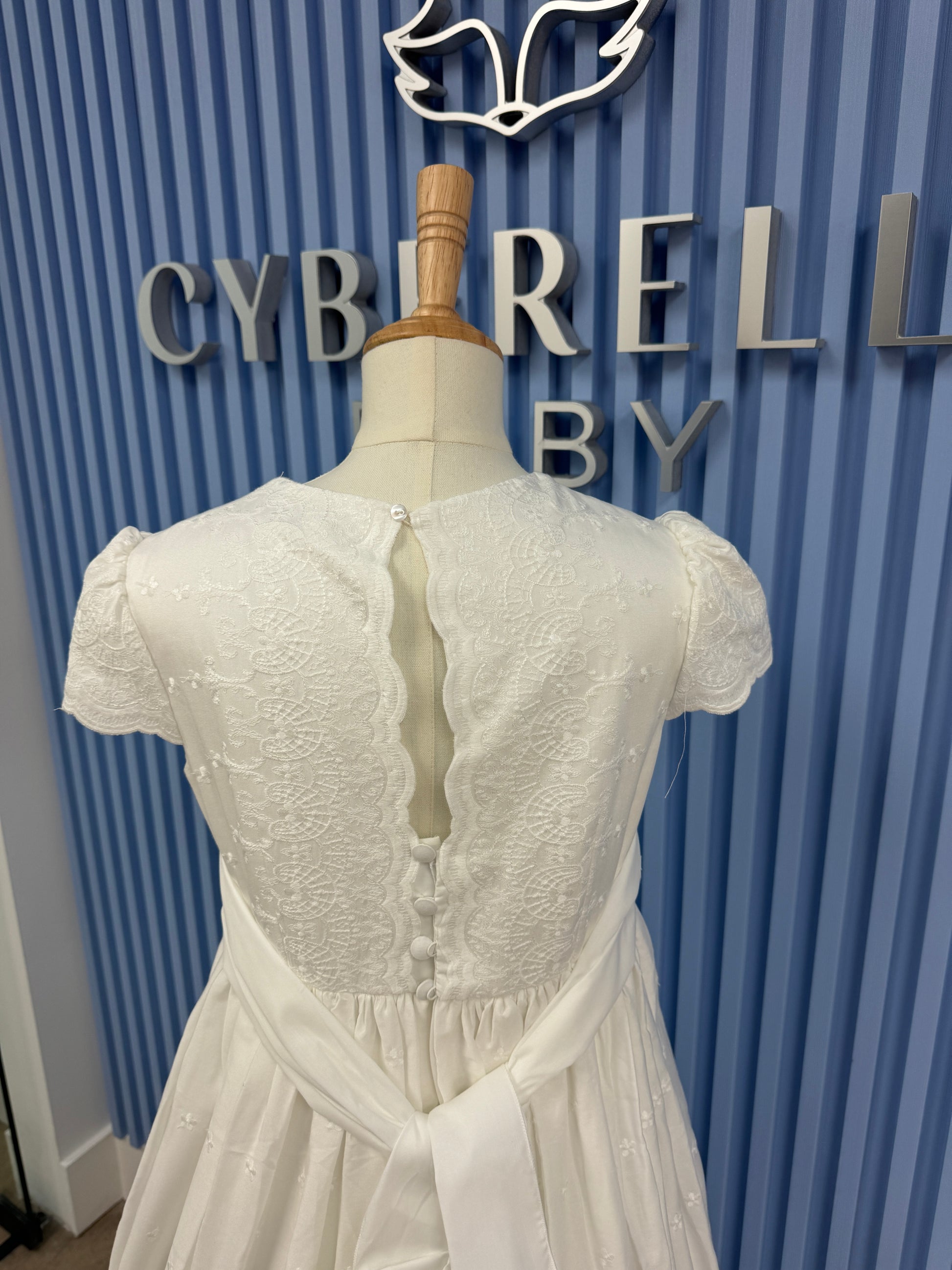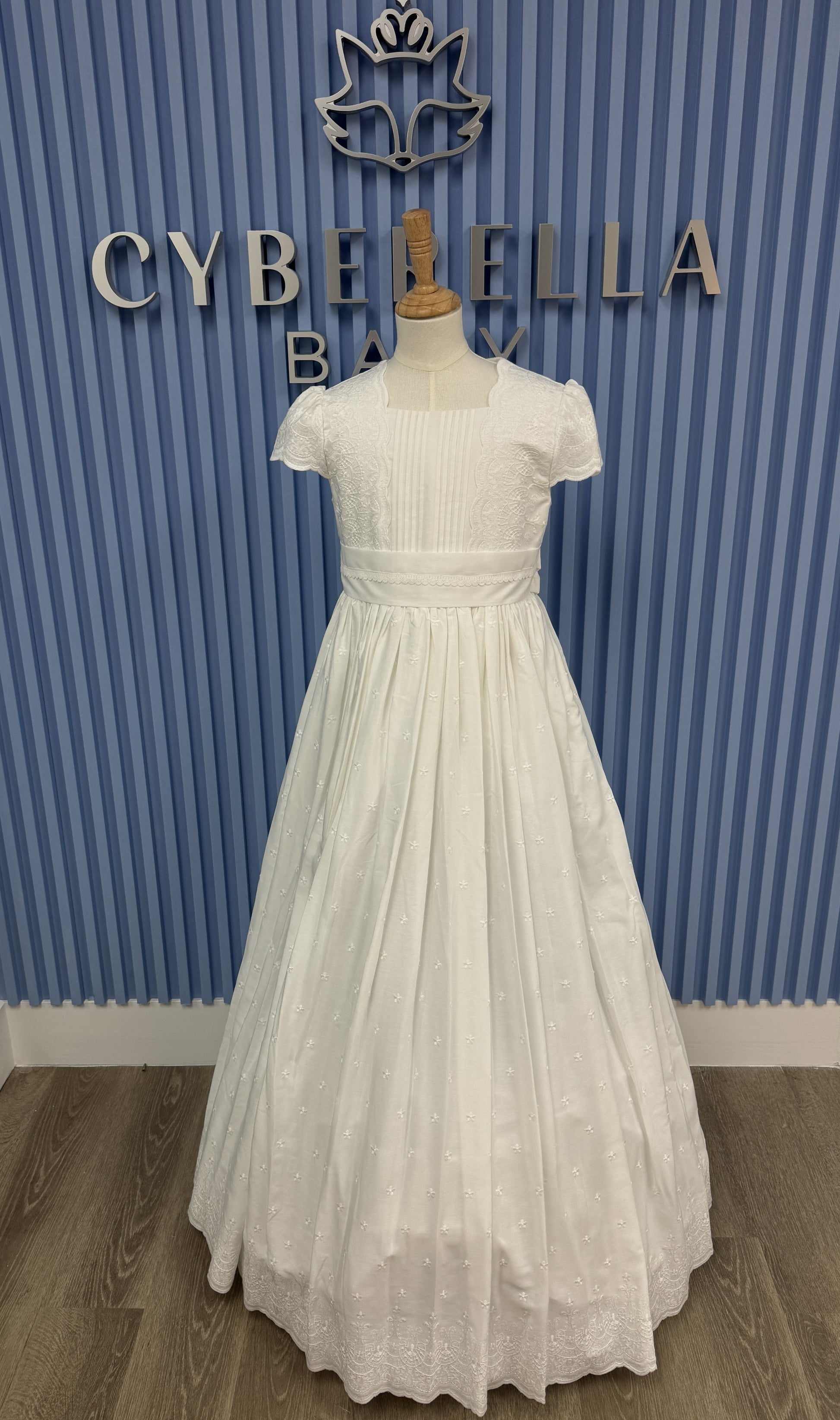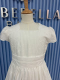 A graceful expression of tradition and innocence, the 5706 dress is designed to make her First Communion truly unforgettable. Handcrafted in Spain, this elegant gown features a delicately embroidered bodice with pintuck detailing, romantic cap sleeves, and a wide sash that defines the waist with subtle refinement. The flowing skirt is scattered with tiny floral motifs and finishes with a scalloped embroidered hem for a heavenly finish.