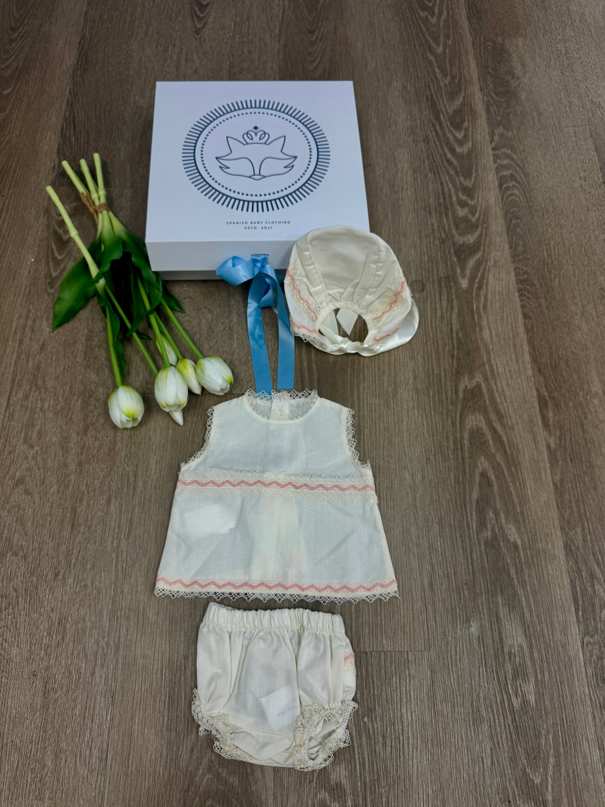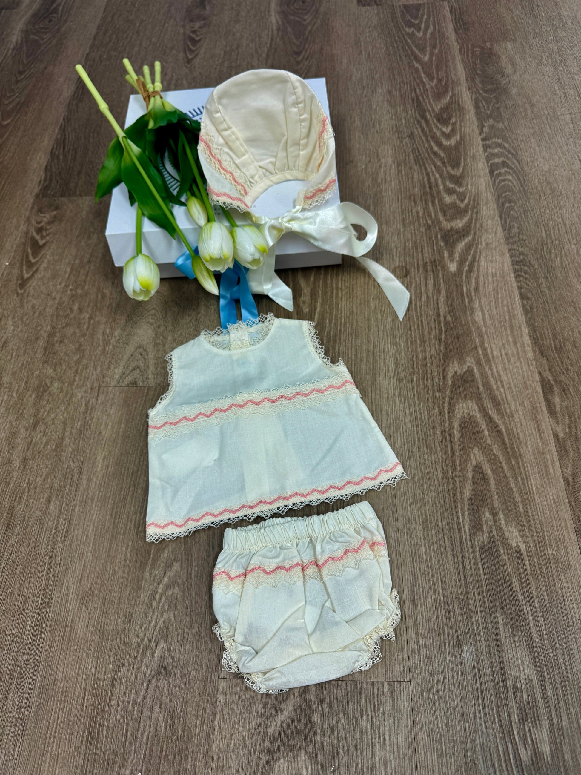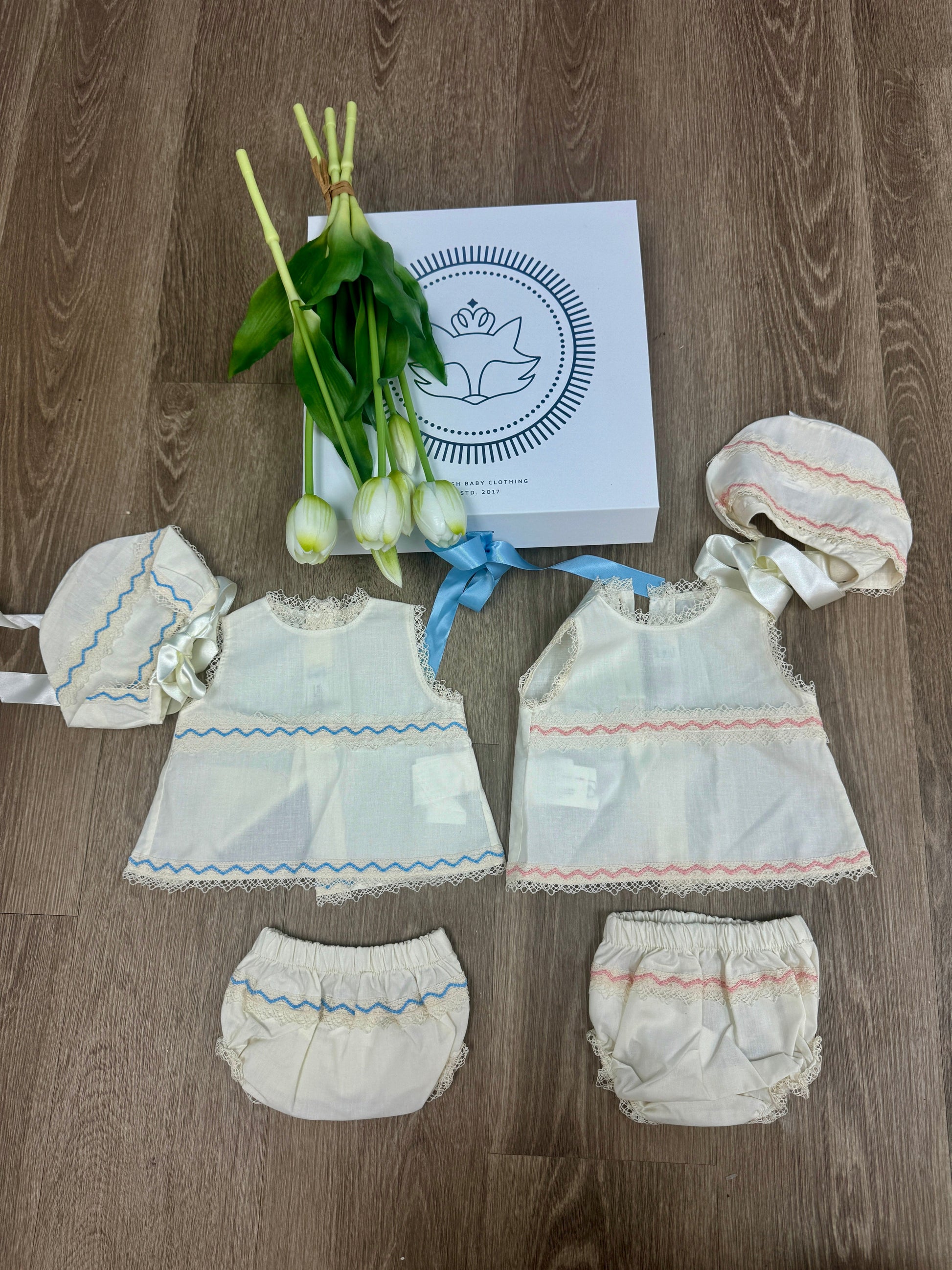 This adorable baby outfit includes a sleeveless blouse, matching bloomer, and bonnet—beautifully handcrafted with delicate lace trim and colored zigzag ribbons. Available in soft blue or pink, it's perfect for special occasions or as a thoughtful newborn gift.