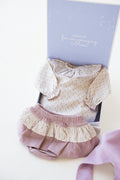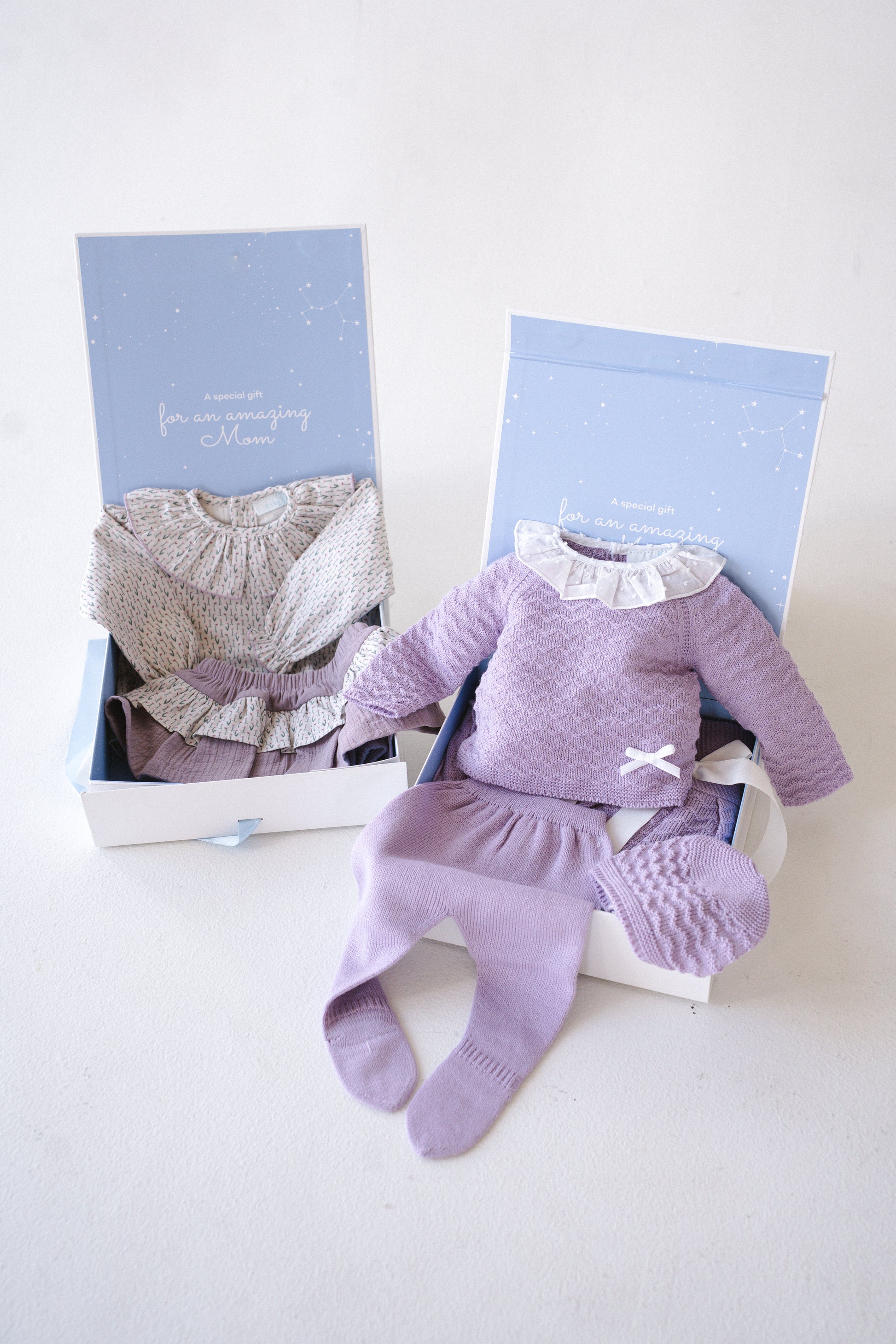 A timeless touch of lavender love. Our 6-piece Sweet Lavender Ensemble comes with a blanket, knit pants, cozy sweater, matching hat, bloomers, and a delicate printed top with ruffles. Designed to make every moment feel beautifully soft and effortlessly chic.