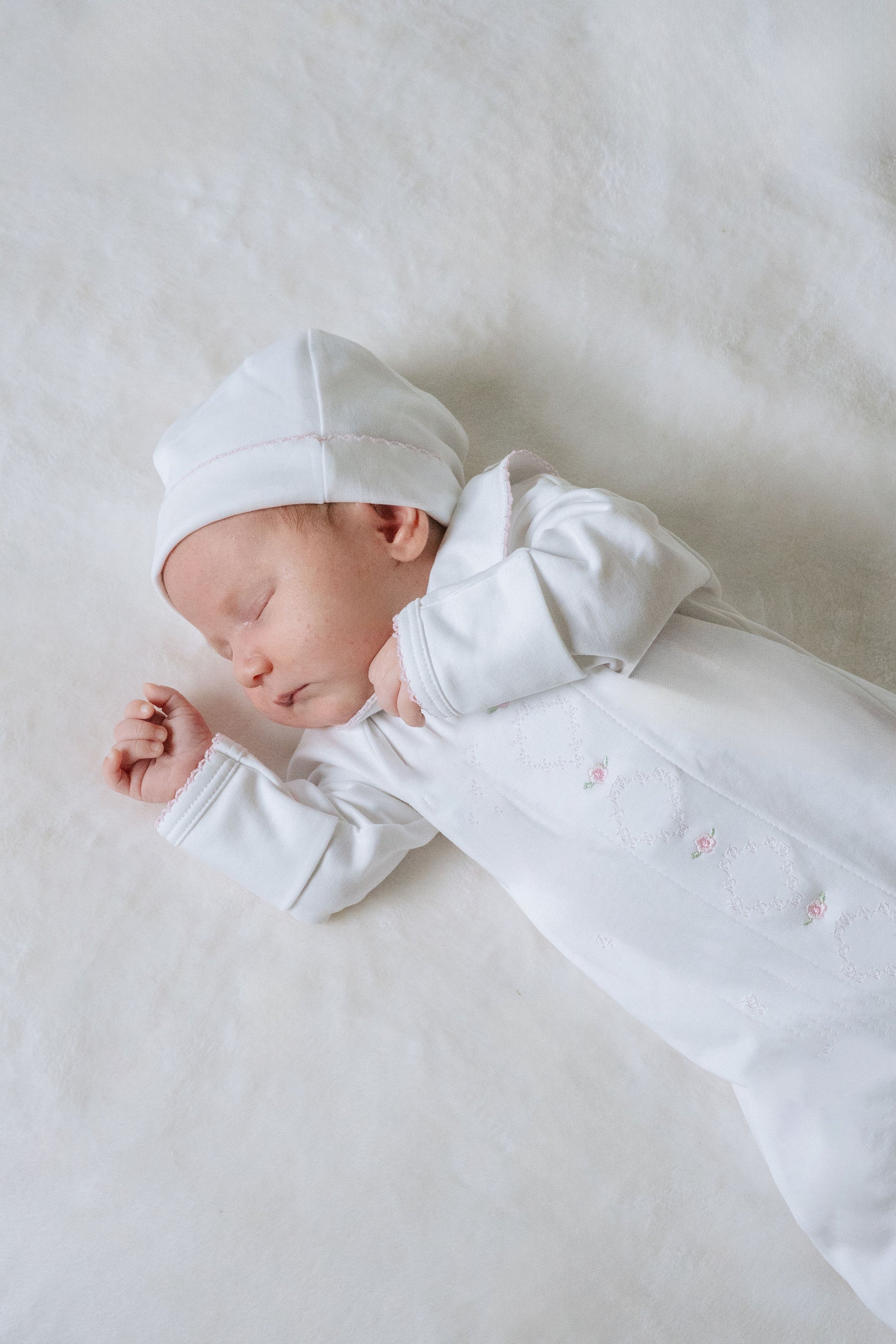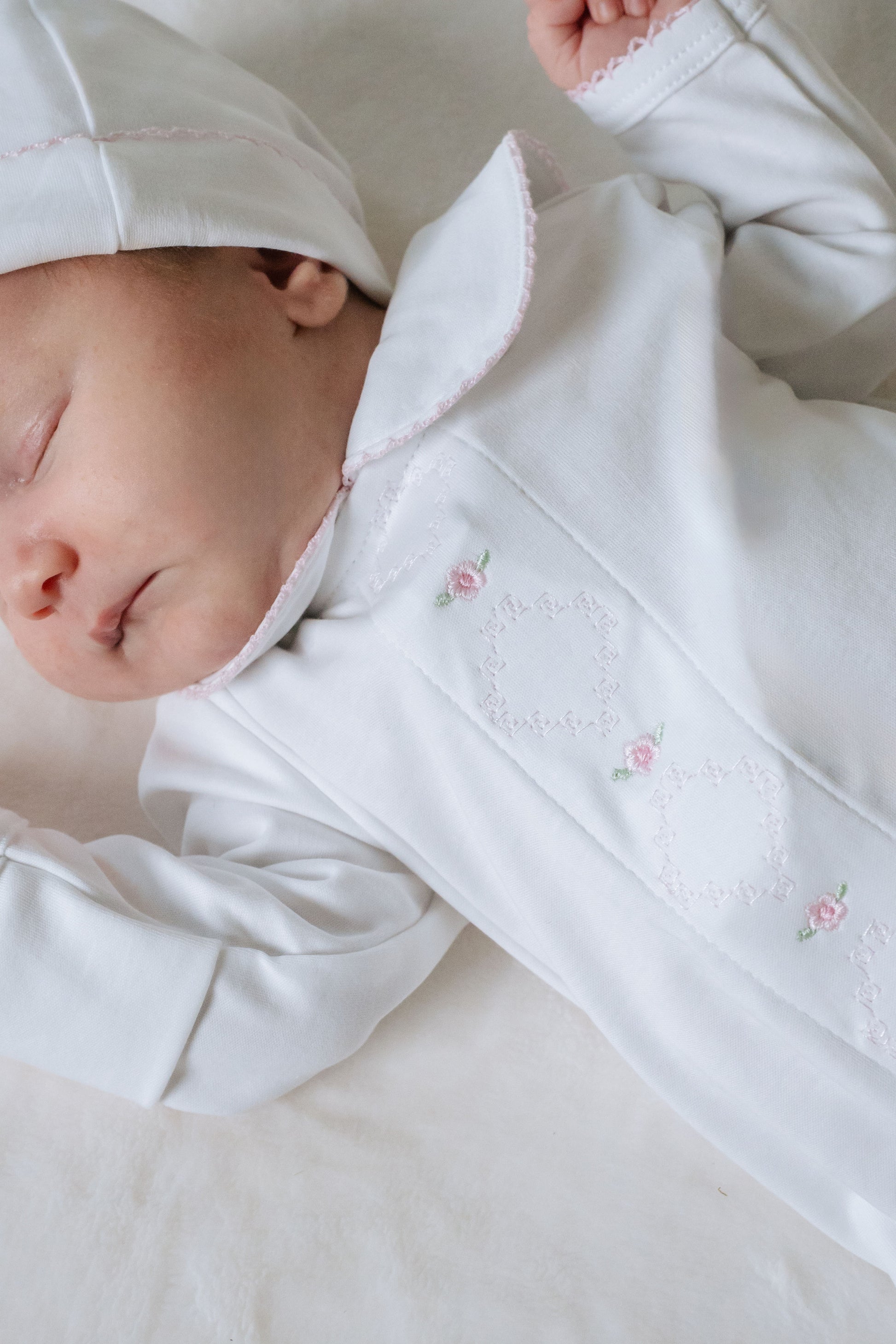 Dress your baby in our Diamond Embroidered Baby Romper with Hat in Pima Cotton for a look that’s both adorable and chic. Shop now to give your little one the gift of comfort and style!