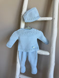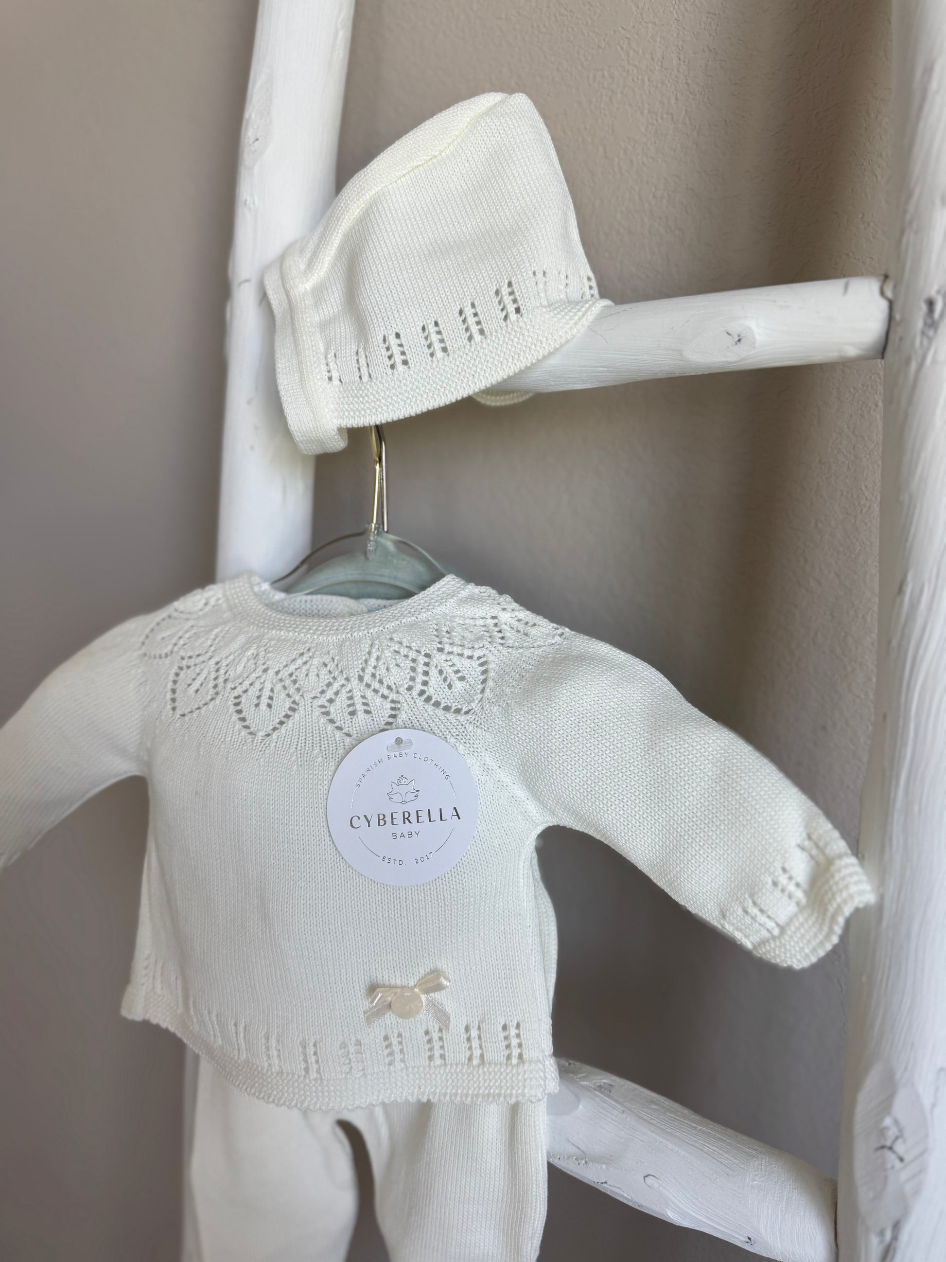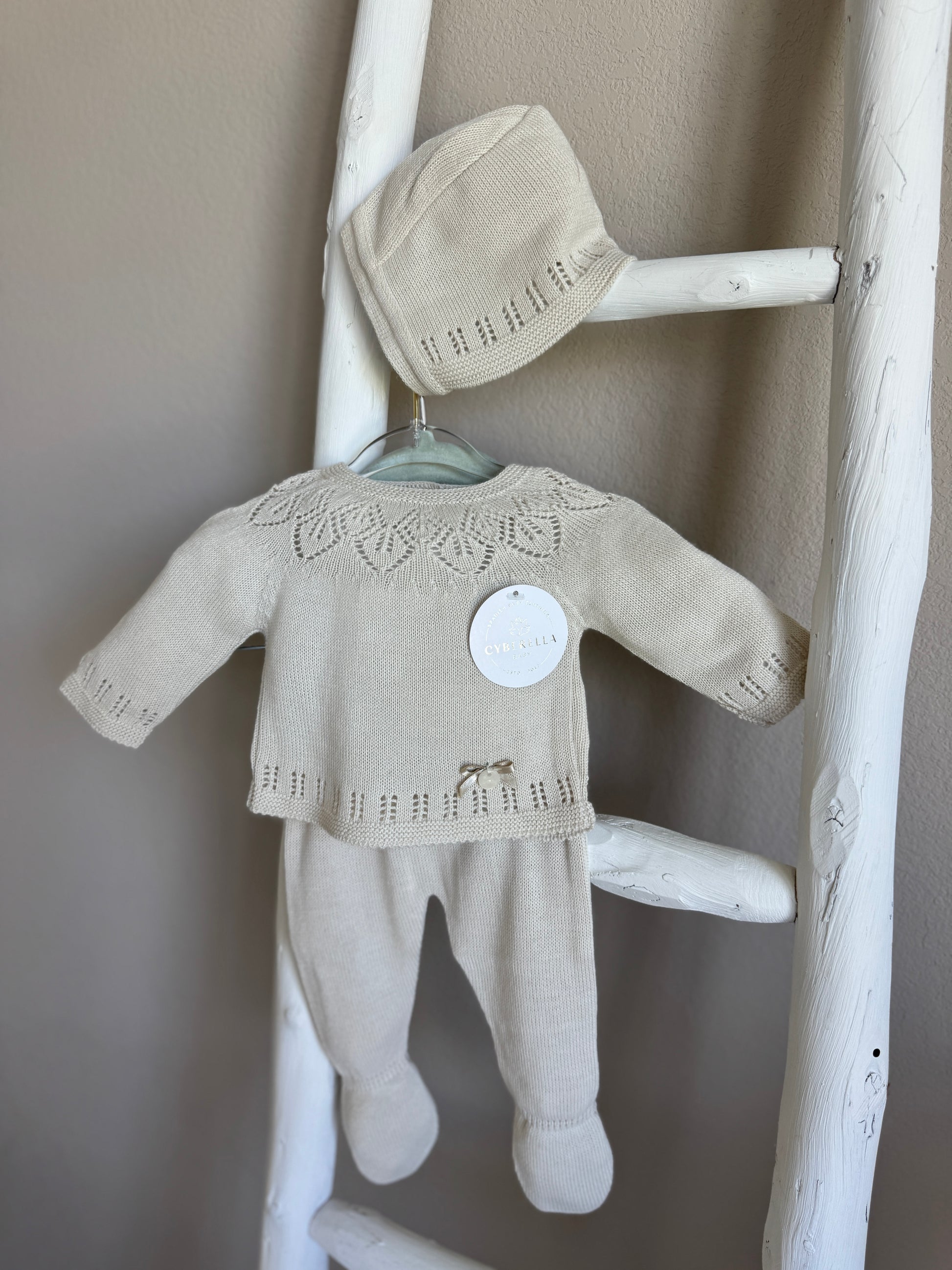 This sweet and timeless 3-piece knit baby set is crafted for elegance and everyday comfort. The soft knit top features delicate openwork detailing and a dainty bow at the waist. Matching footed pants and a cozy bonnet with a button closure complete the look.