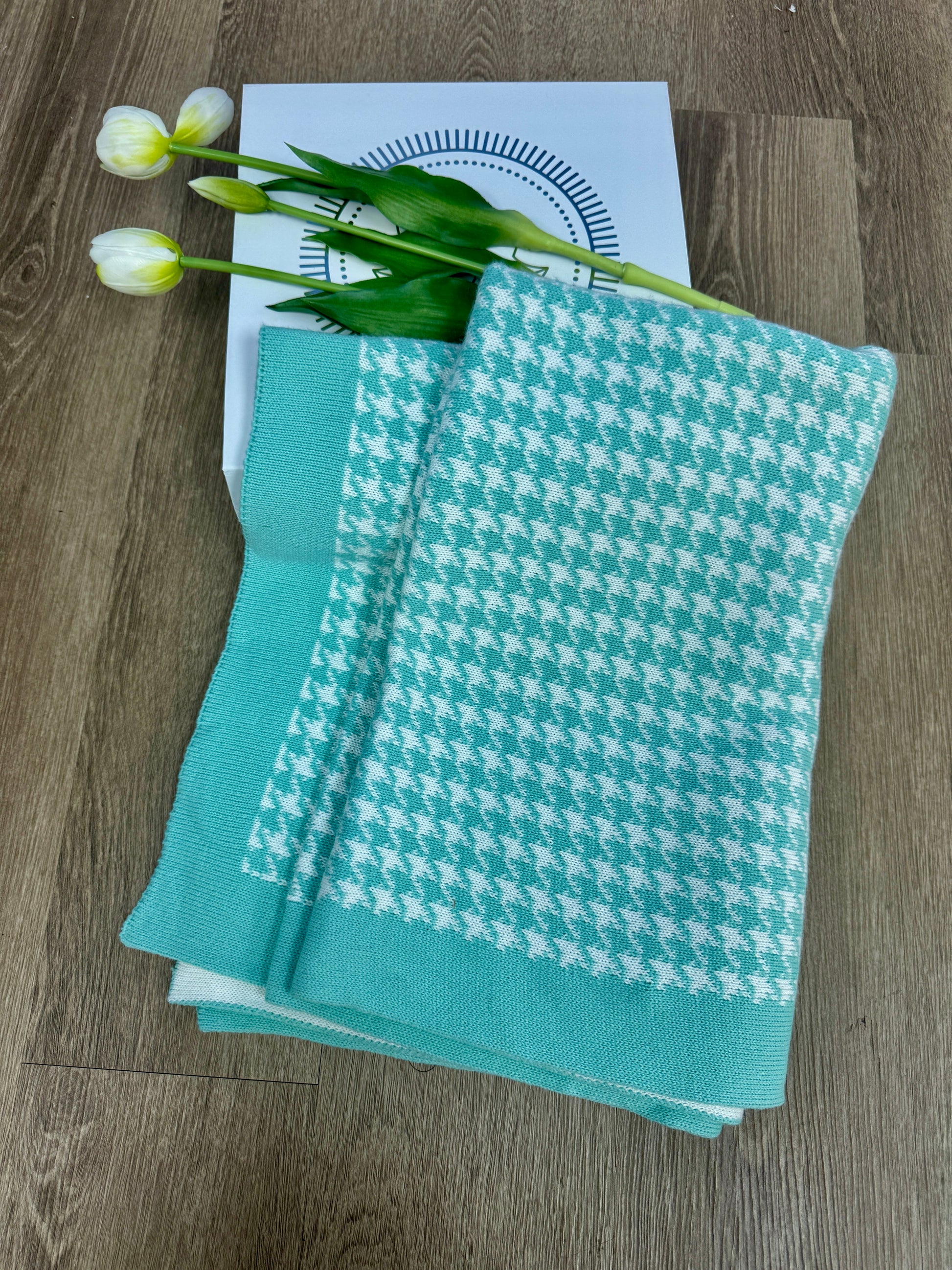 Add a touch of timeless elegance to your nursery with this soft knit baby blanket in a charming mint and white houndstooth pattern. Crafted in Spain, this blanket blends classic design with cozy comfort, perfect for stroller rides, naps, or cuddles at home. The lightweight knit fabric is gentle on your baby’s skin, while the stylish pattern adds a sophisticated flair to any setting.