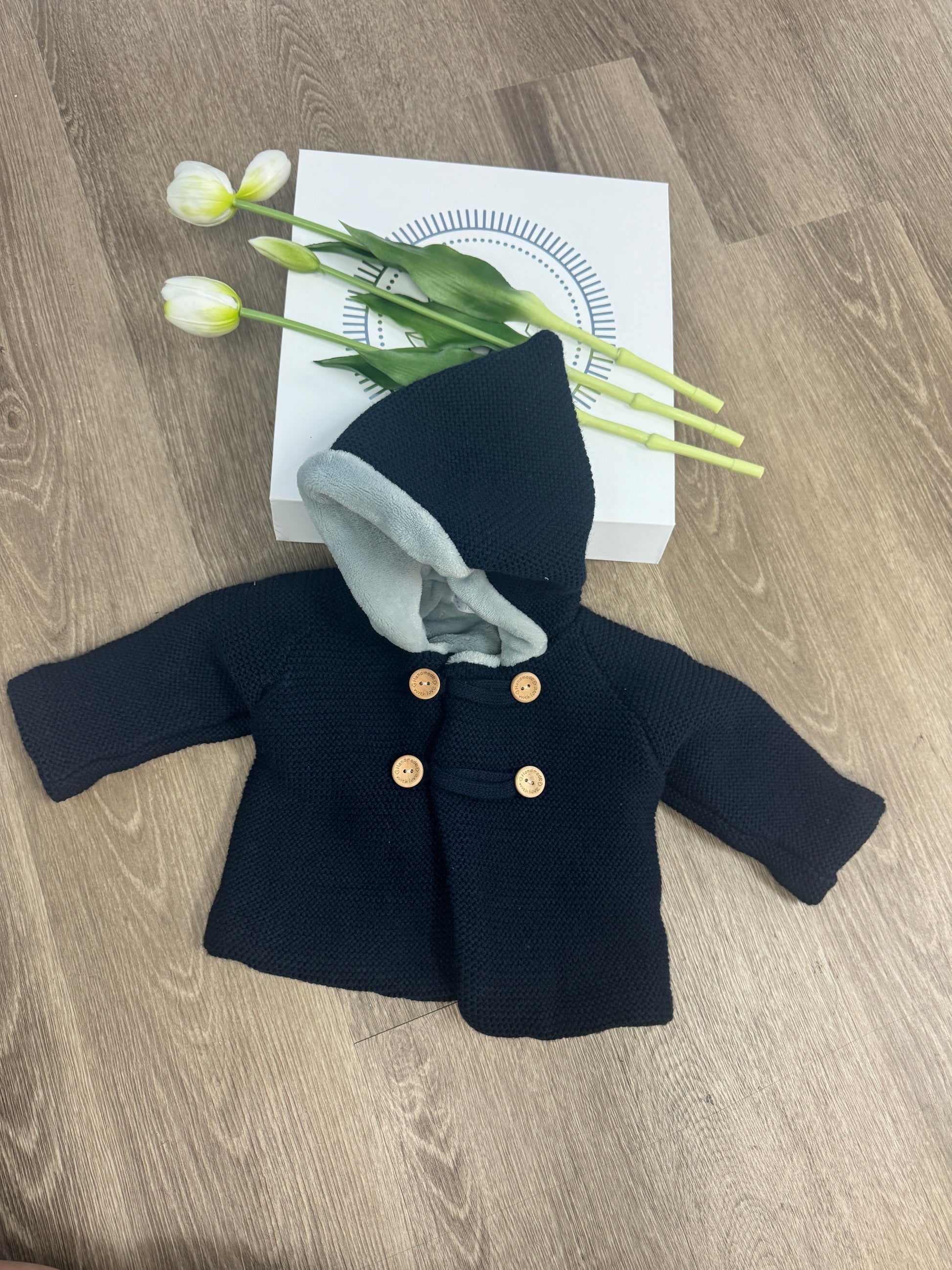 Navy blue Knit Baby Jacket with Fleece Hood and Wooden Buttons