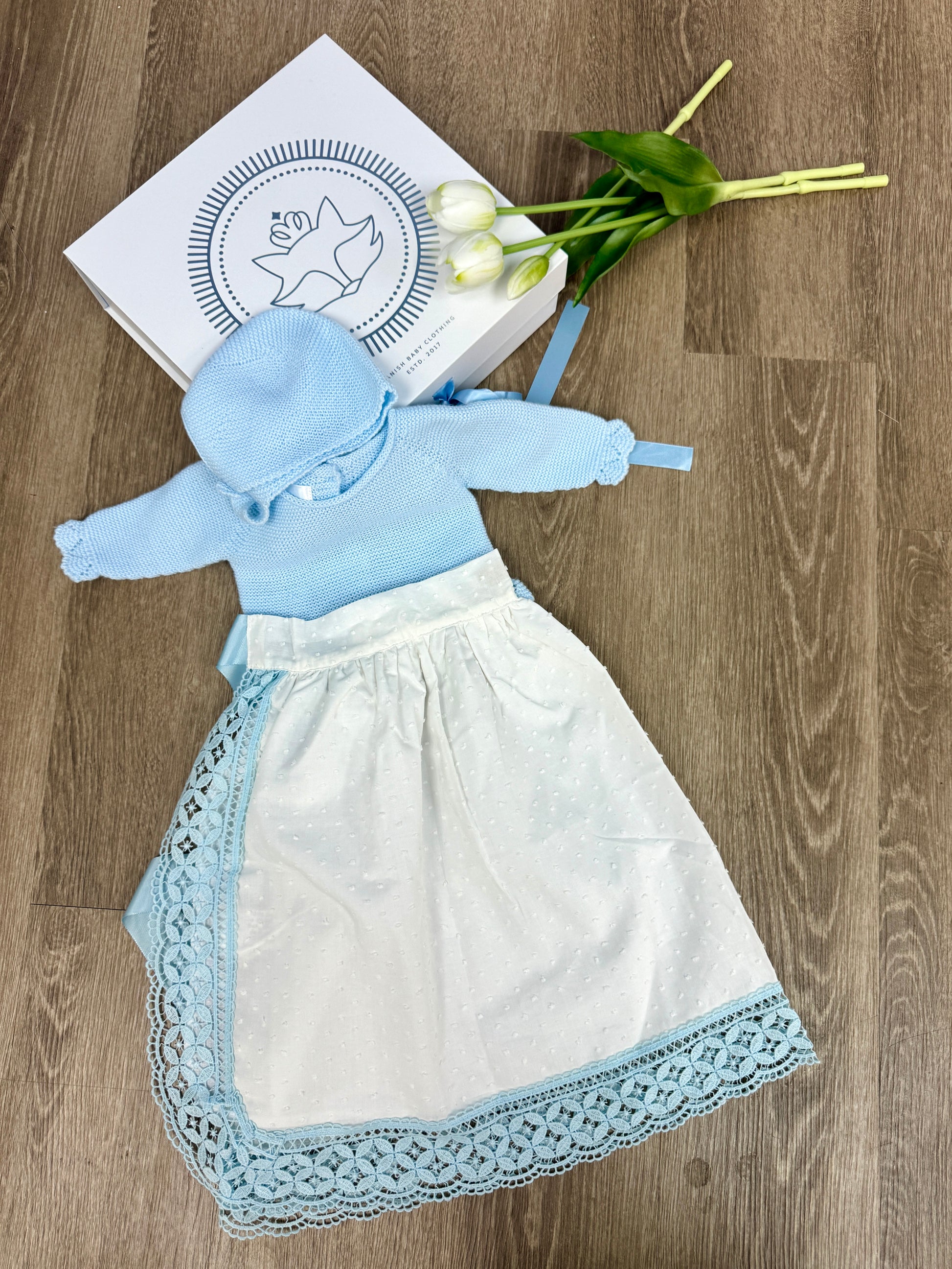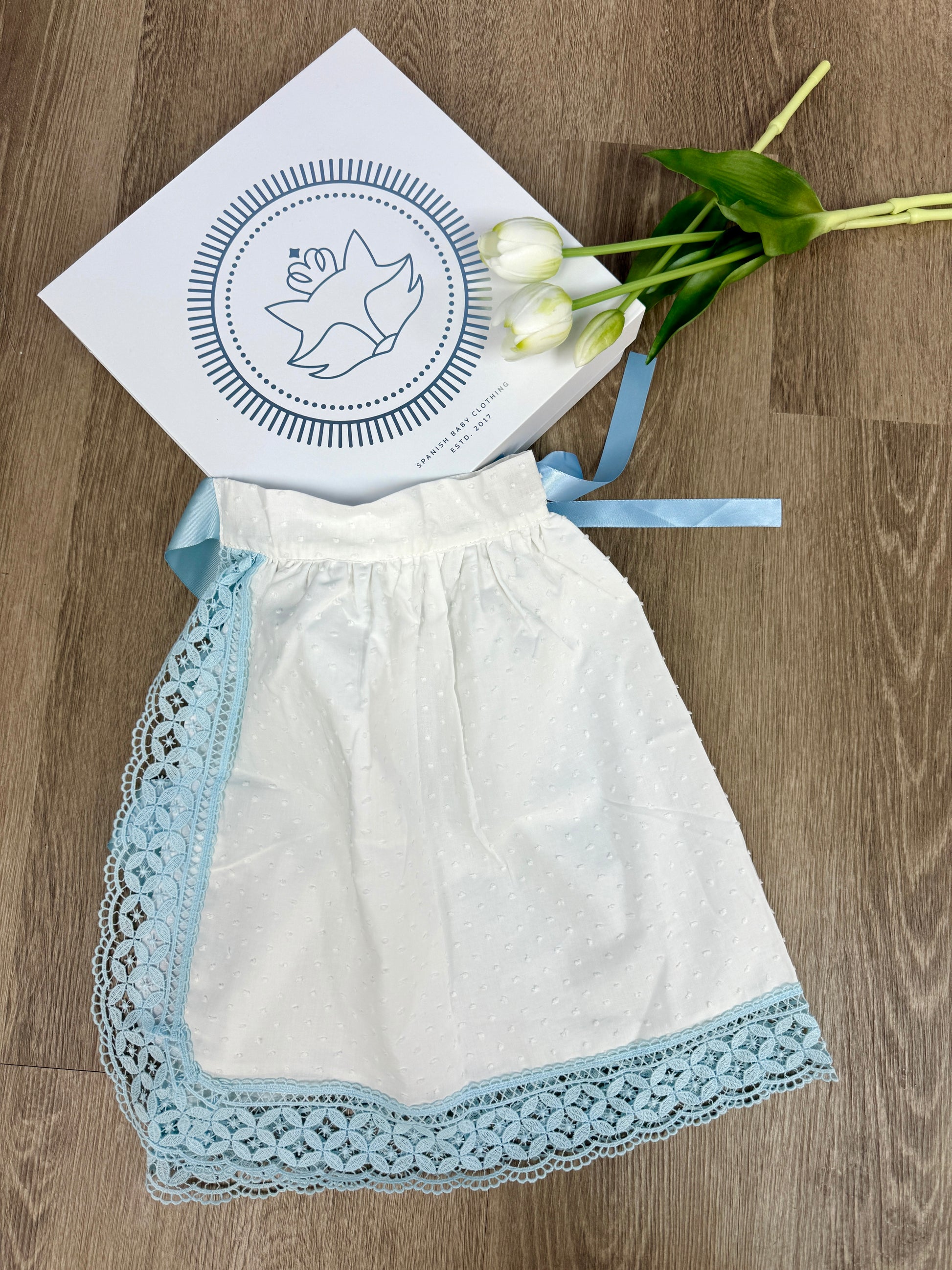 Wrap your little one in timeless charm with our newborn baby overlay skirt, delicately designed with soft white dotted fabric and light blue lace trim. This heirloom-style piece ties gently at the waist and is perfect to layer over your baby's outfit on the special day they come home from the hospital.