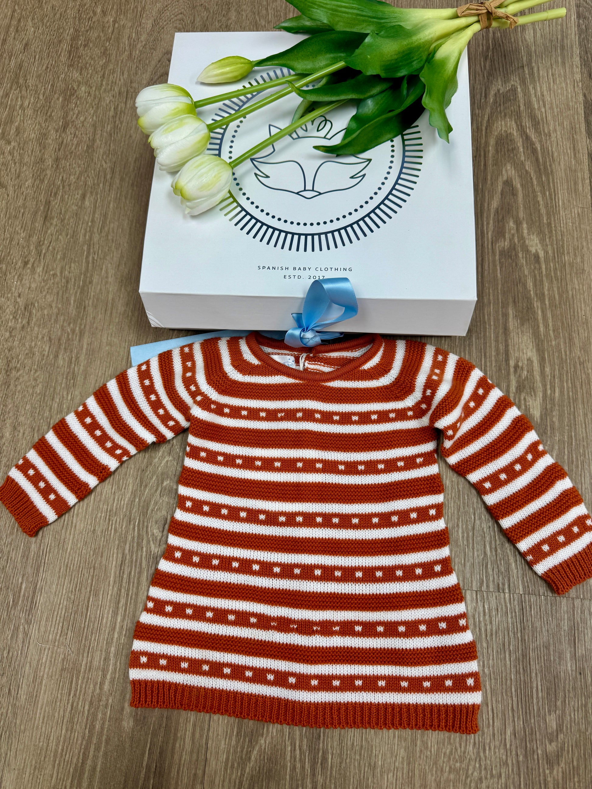 This cozy and stylish knitted baby dress features a charming rust and white striped design with delicate mini dot details. Made with soft, breathable yarn, it’s perfect for cooler days while still being gentle on your baby's skin. A beautiful everyday outfit or a sweet option for special outings.