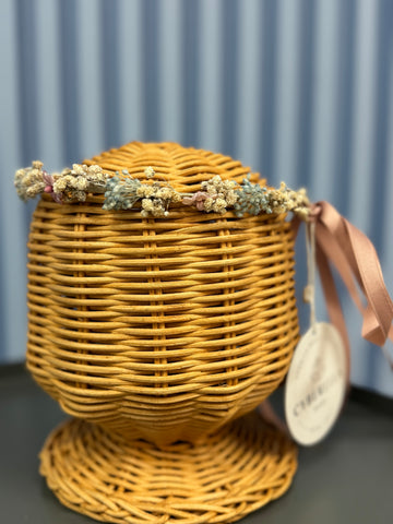 An exquisite floral crown featuring preserved flowers in soft pastel hues of blue and pink, delicately woven together. The handcrafted design includes blush pink resin flowers, dried gypsophila, and subtle ivory details for a romantic and timeless look. Finished with a dusty rose satin ribbon for an adjustable fit, this piece is the perfect accessory for a special ceremony, first communion, or elegant celebration.