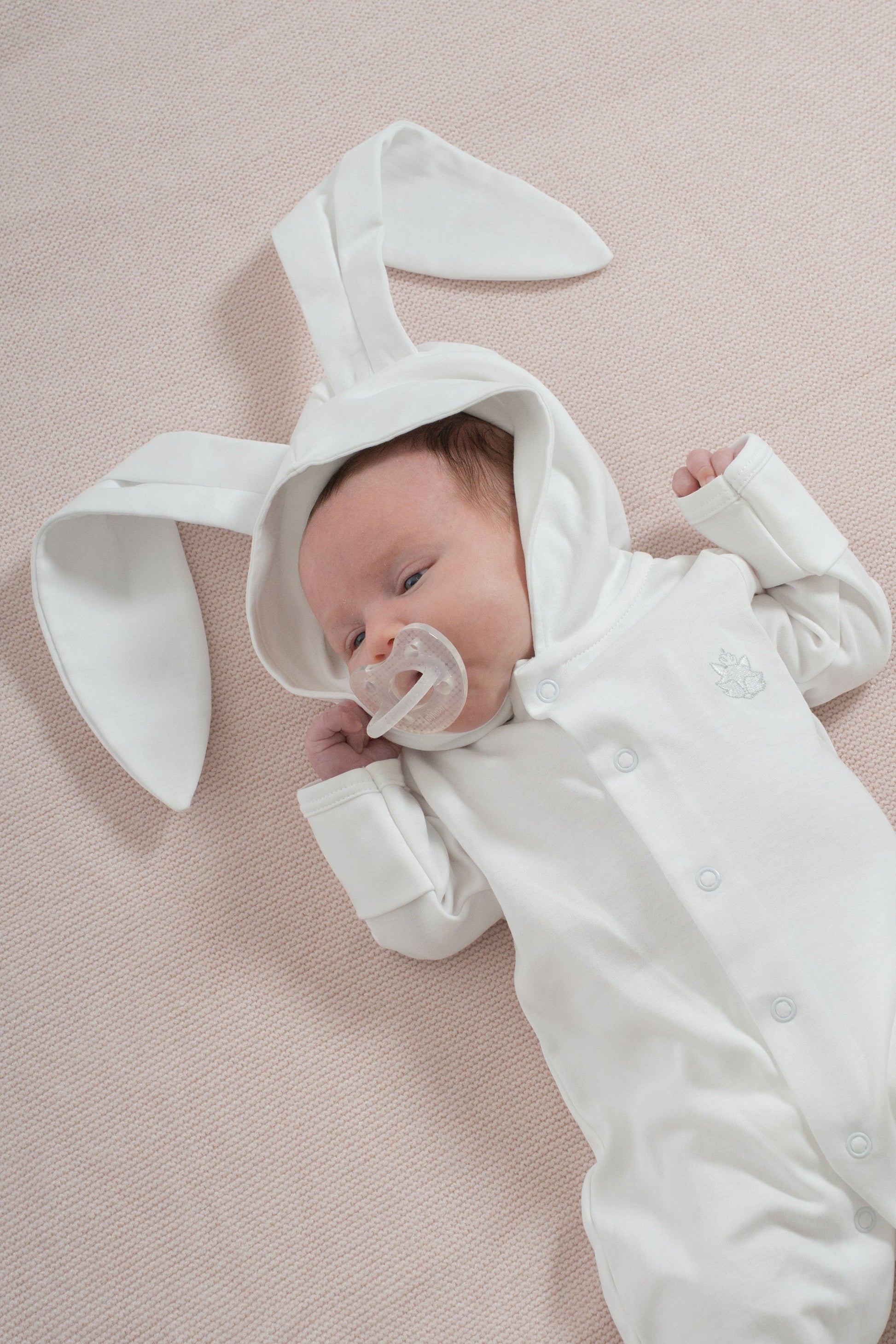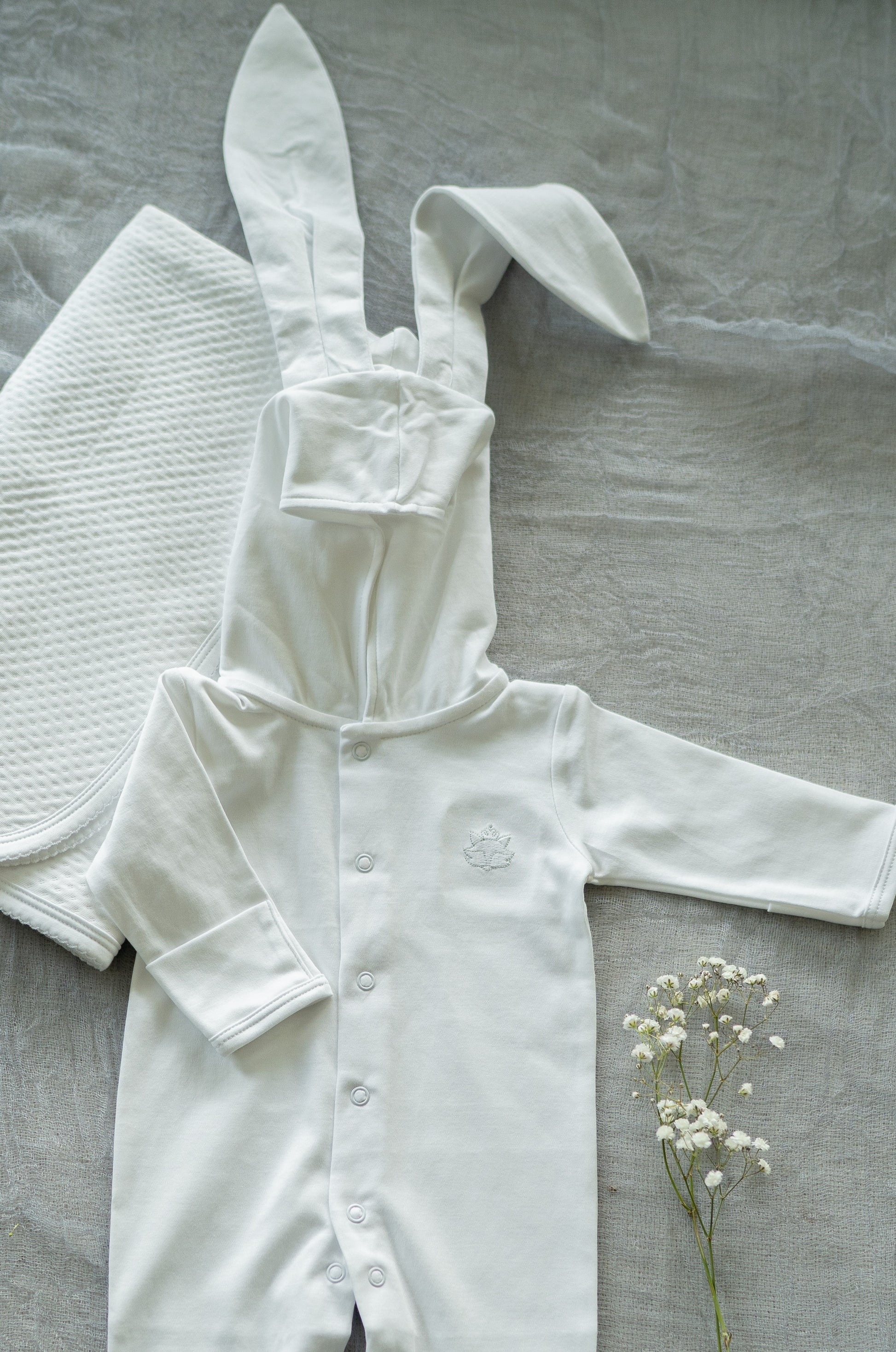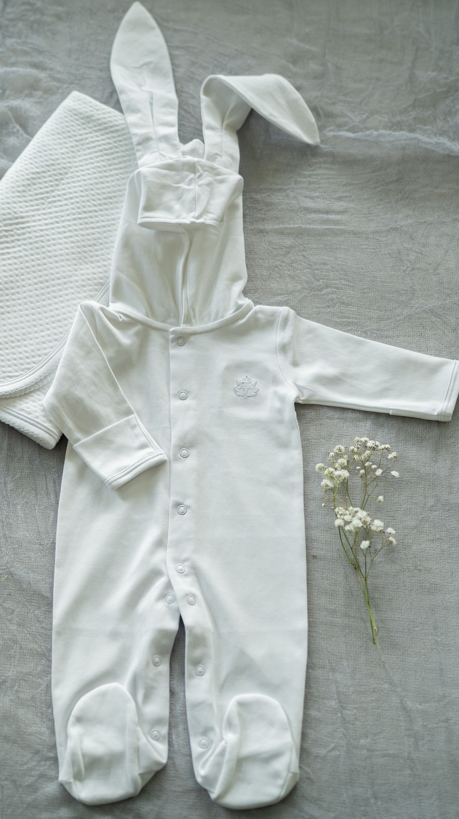 White Pima Cotton Baby Romper with Bunny Ears | Adorable Infant Outfit