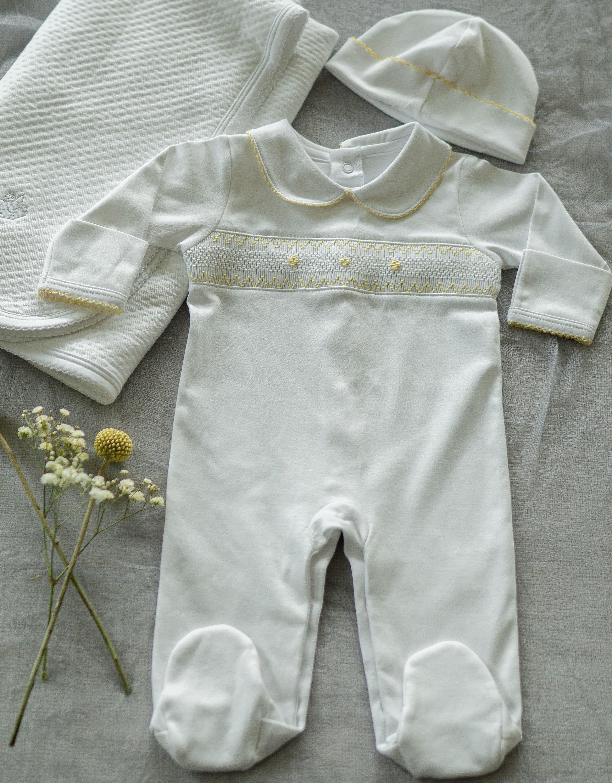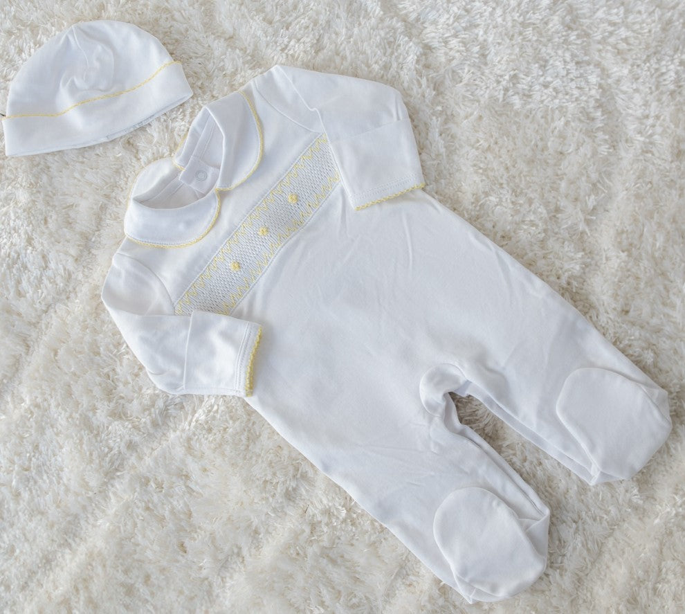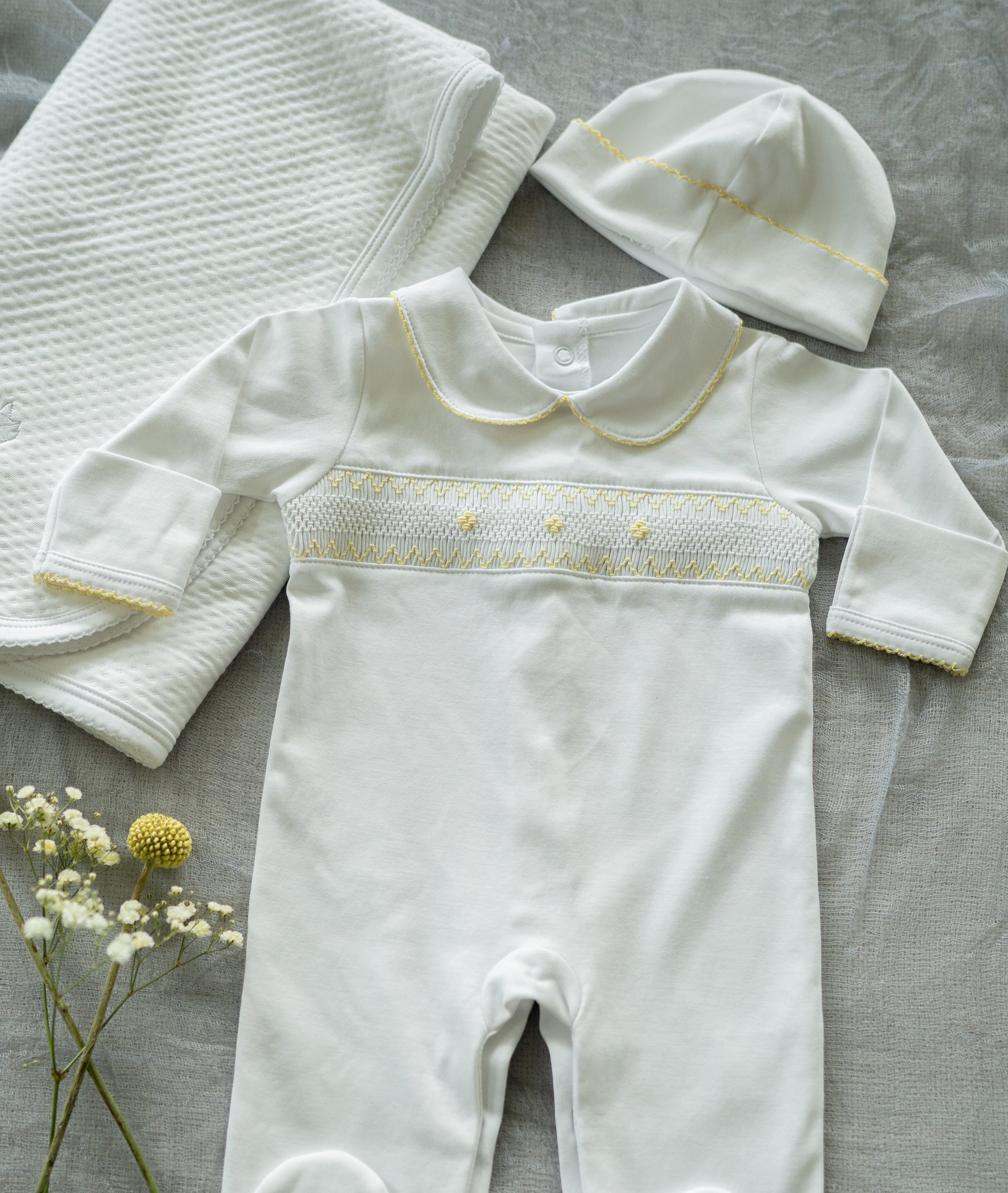 Yellow Pima Cotton Smocked Romper with Hat | Soft Baby Outfit for First Wear