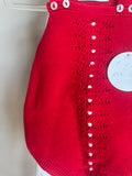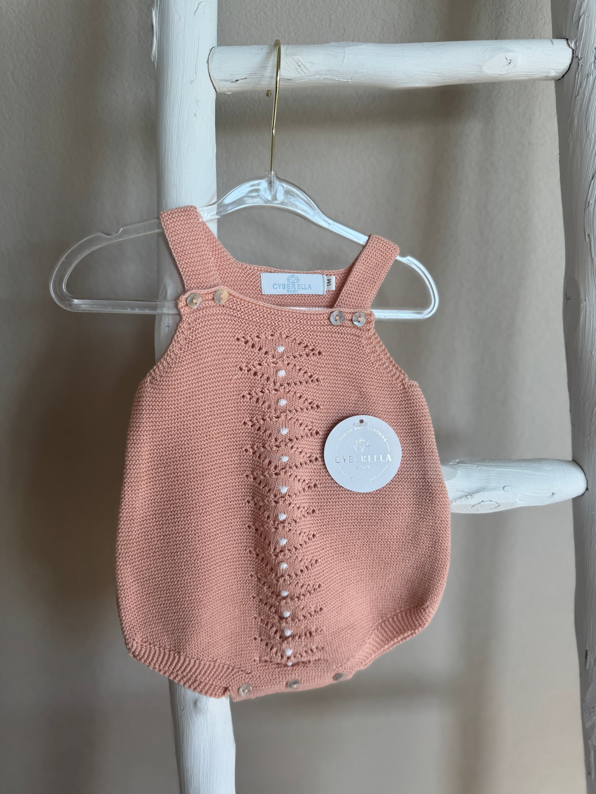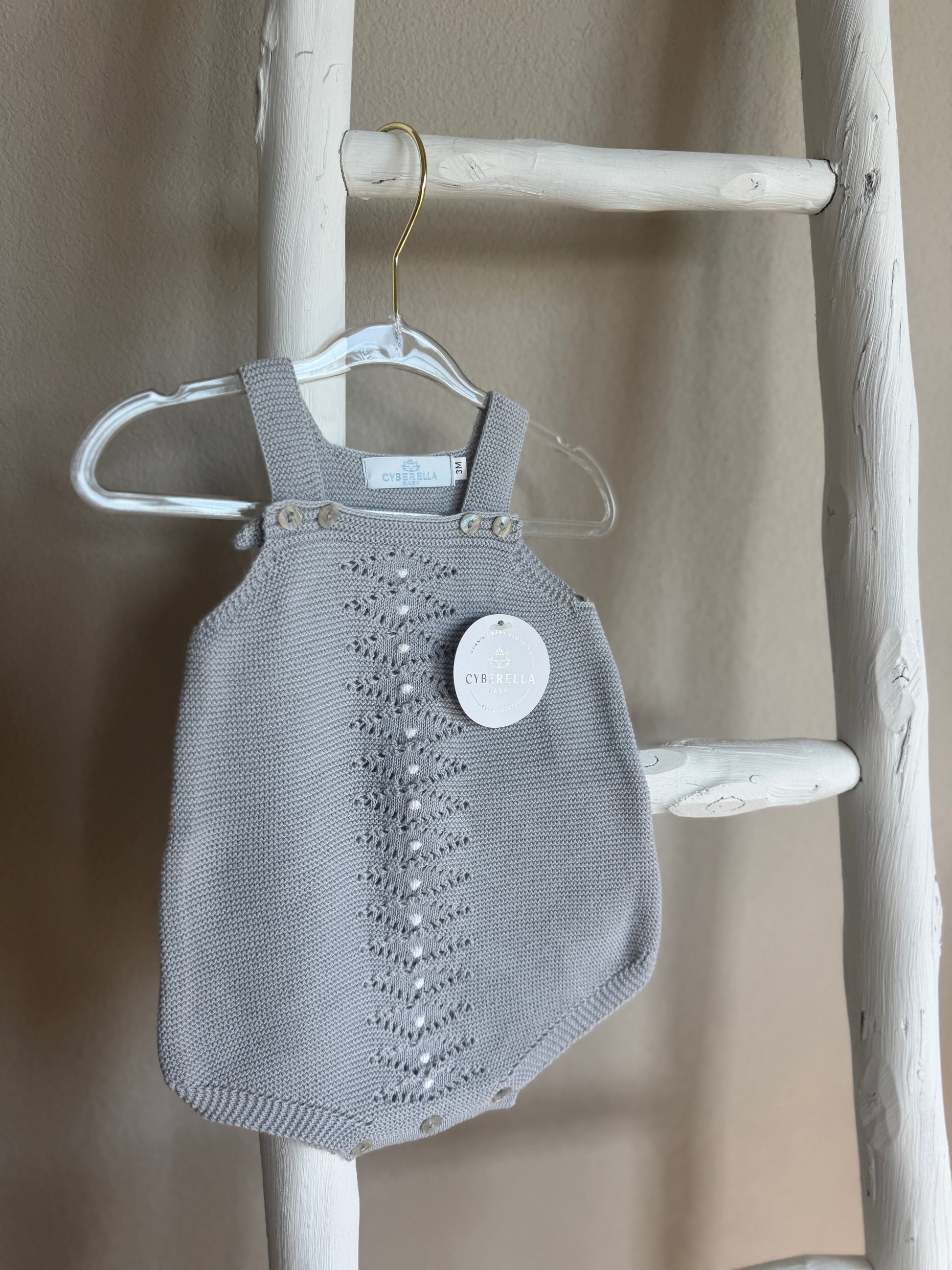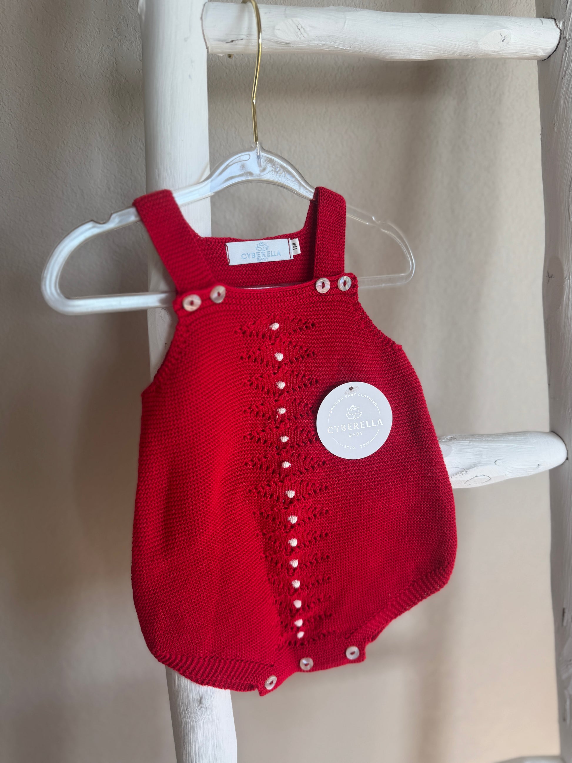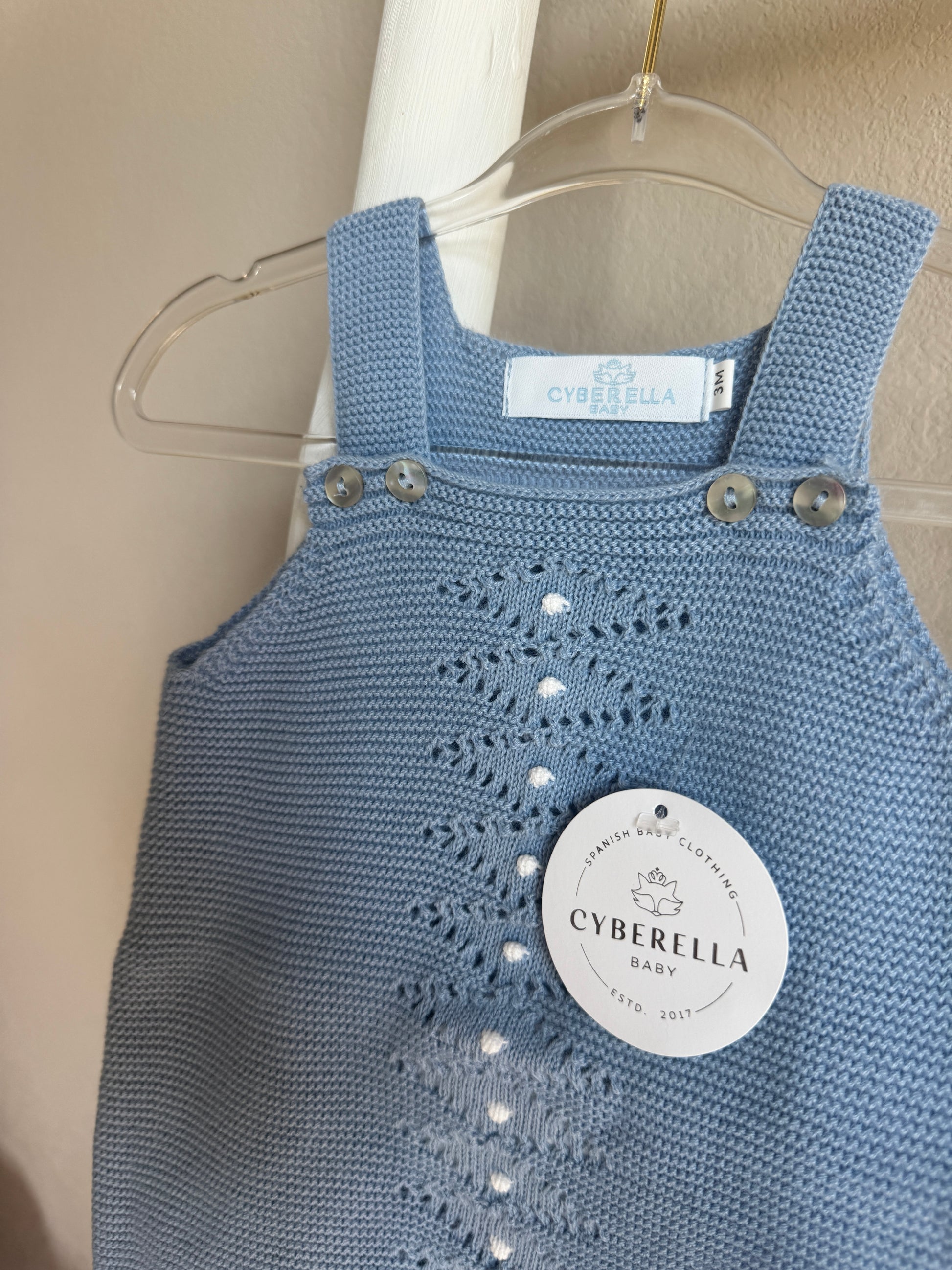 This adorable knit baby romper features a charming vertical openwork pattern accented with classic white polka dots for a touch of whimsy. Designed with secure button straps and bottom snaps for easy dressing and diaper changes, this piece blends comfort, practicality, and style.