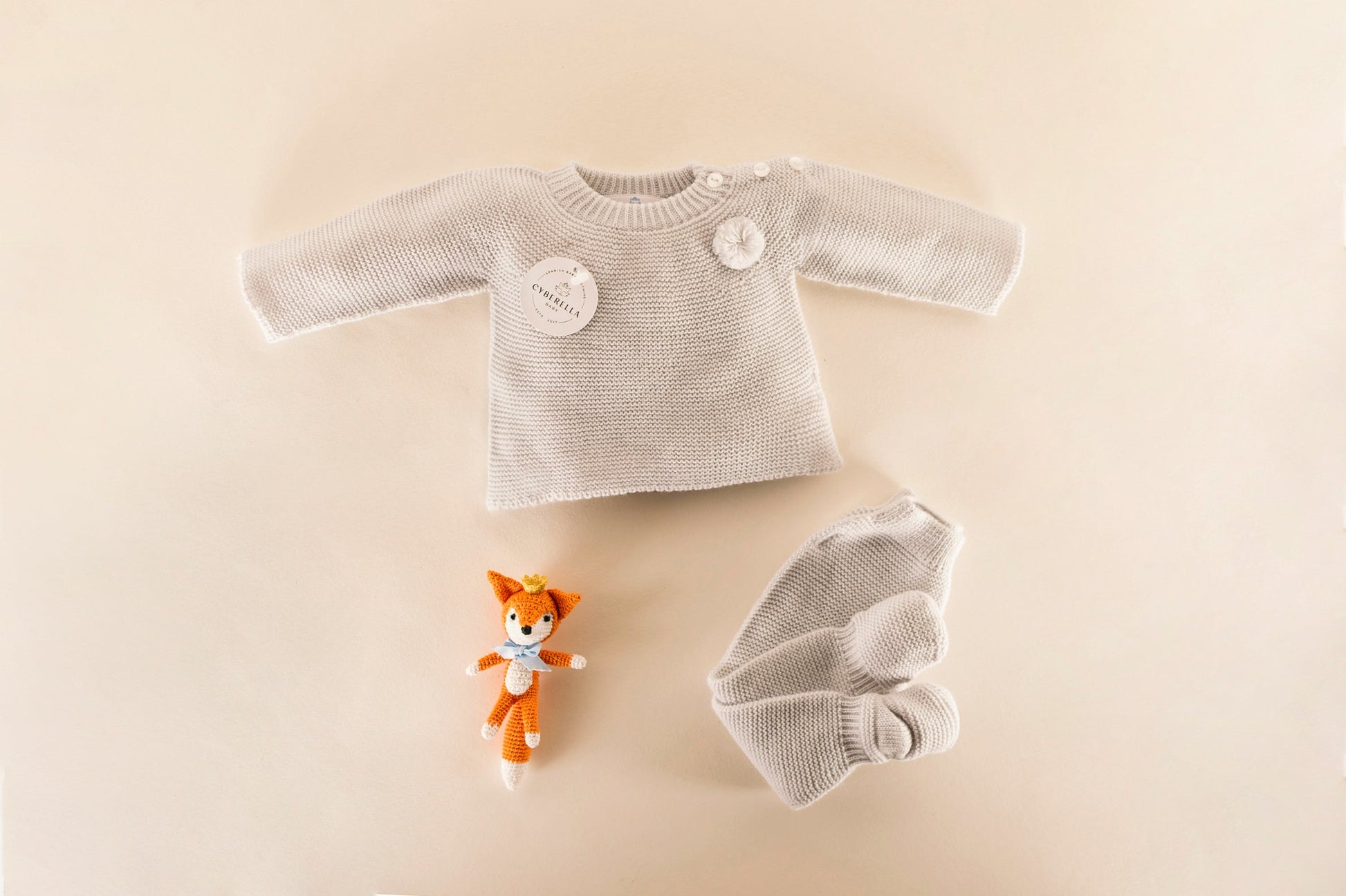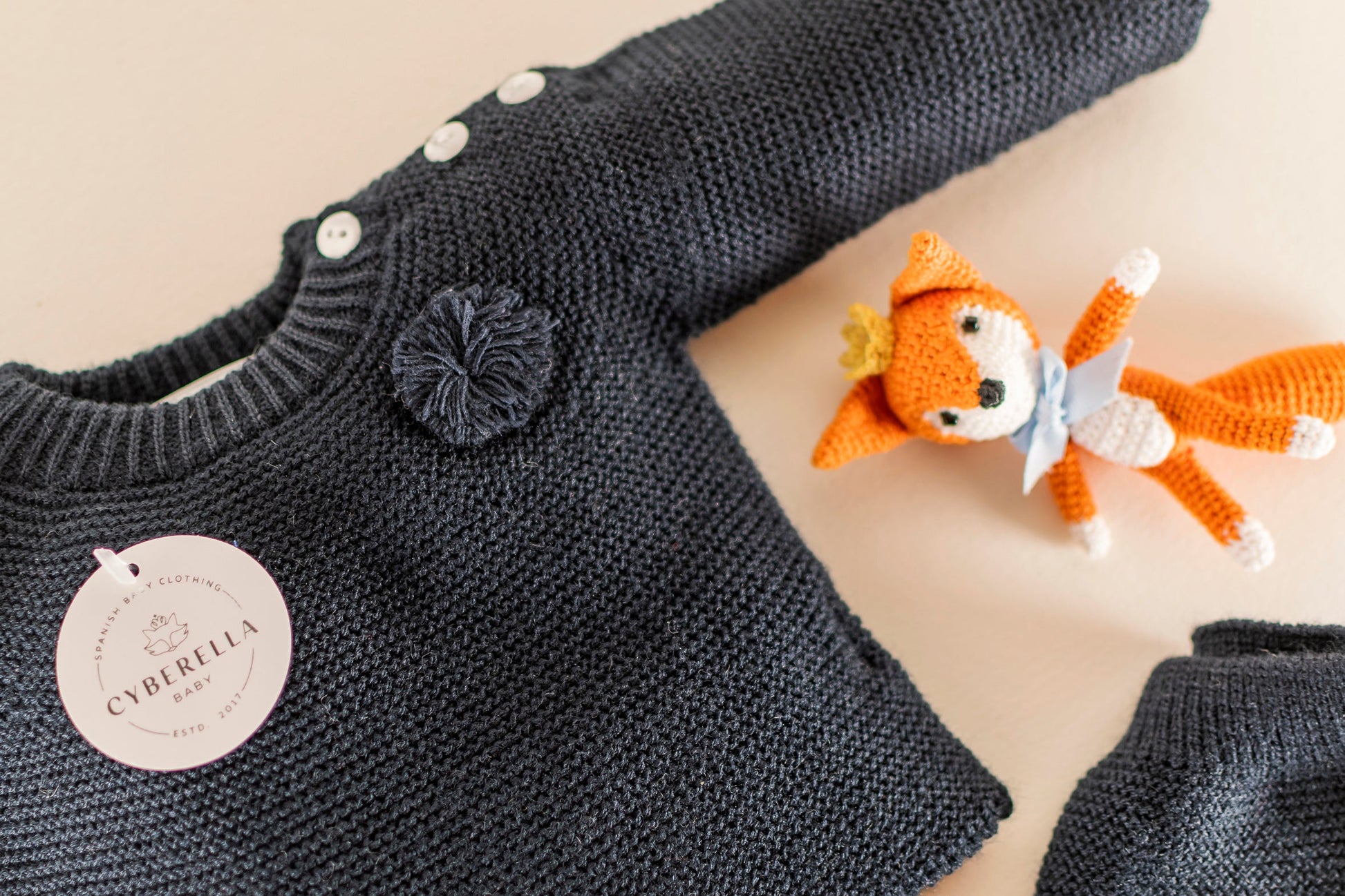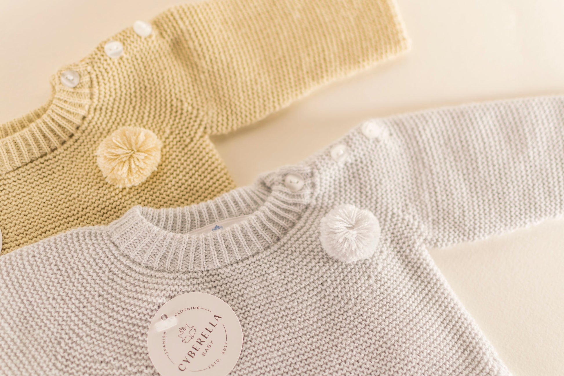 Elegant Knit Baby Set – pom pom Sweater & Footed Pants