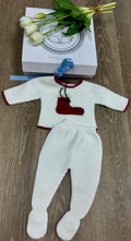 Dress your little one in comfort and charm with this adorable 2-piece knitted baby outfit. Crafted from soft, breathable yarn, the set includes a cozy long-sleeve top with a red boot detail and matching footed pants. The red trim adds a classic touch to this timeless look — perfect for baby showers, gifts, or everyday cuddles.