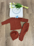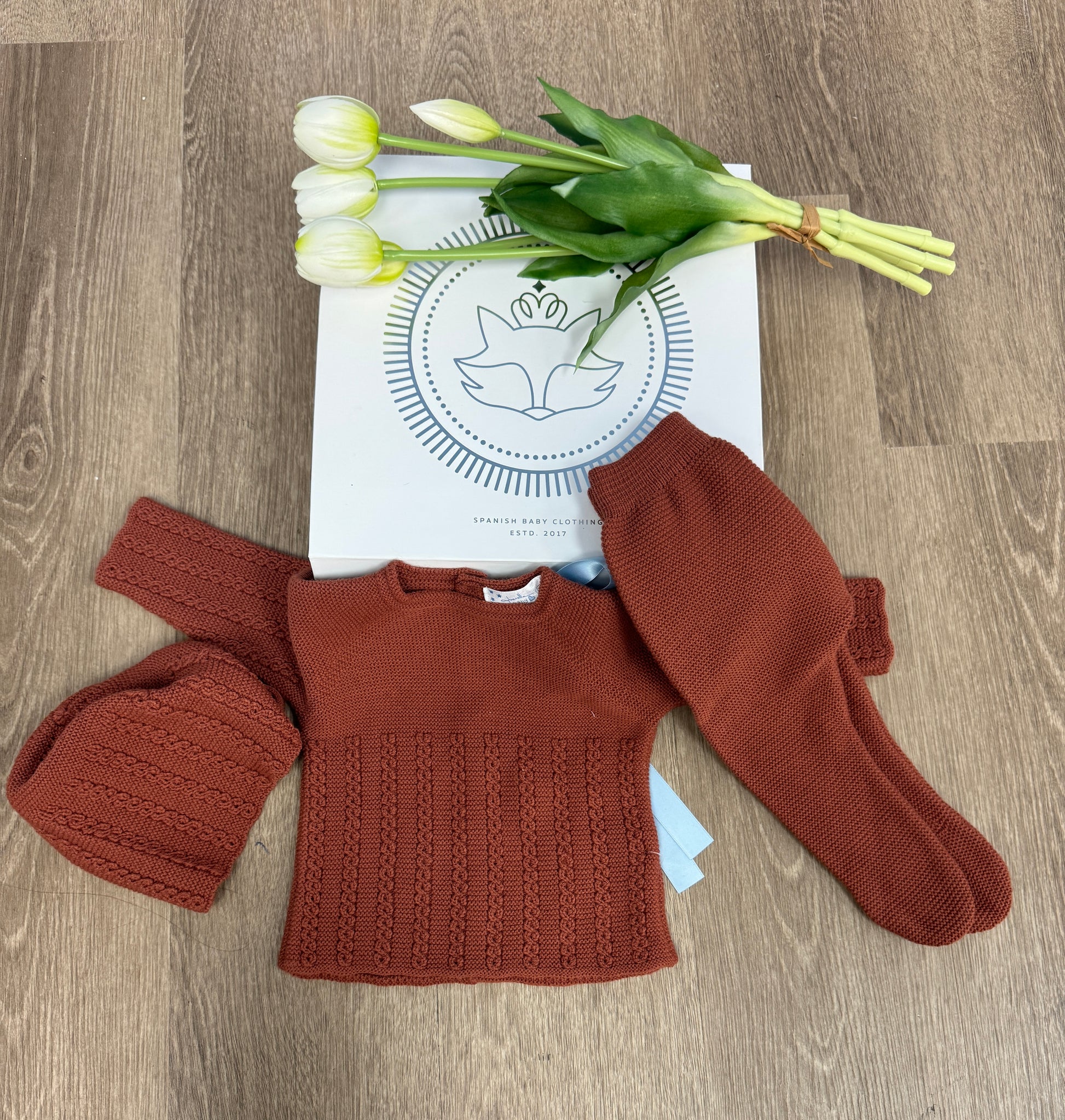 Wrap your little one in warmth and style with this beautifully handcrafted knit baby set. Made from soft, breathable fabric, this 3-piece ensemble includes a cozy sweater, matching footed pants, and an adorable bonnet. Featuring intricate knit patterns and a timeless rust color, this outfit is perfect for special occasions, photoshoots, or everyday elegance. Designed for comfort and flexibility, it's a must-have addition to your baby's wardrobe.