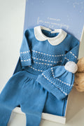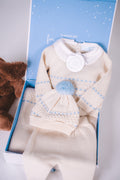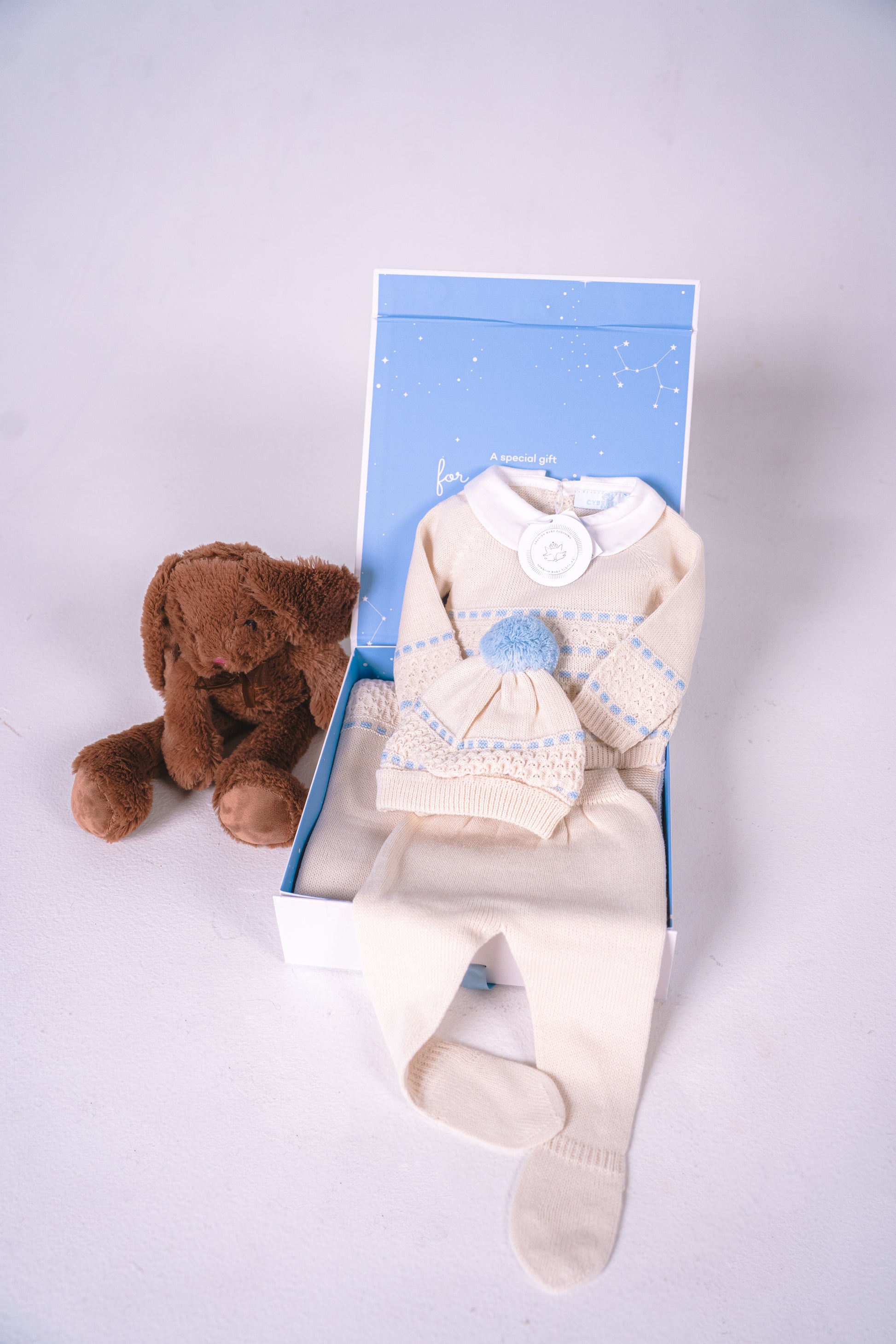 Soft as a dream and crafted with love. Our Teddy Bear Knit Set is a 4-piece ensemble that includes a knitted sweater, matching footed pants, a cozy blanket, and an adorable hat.