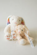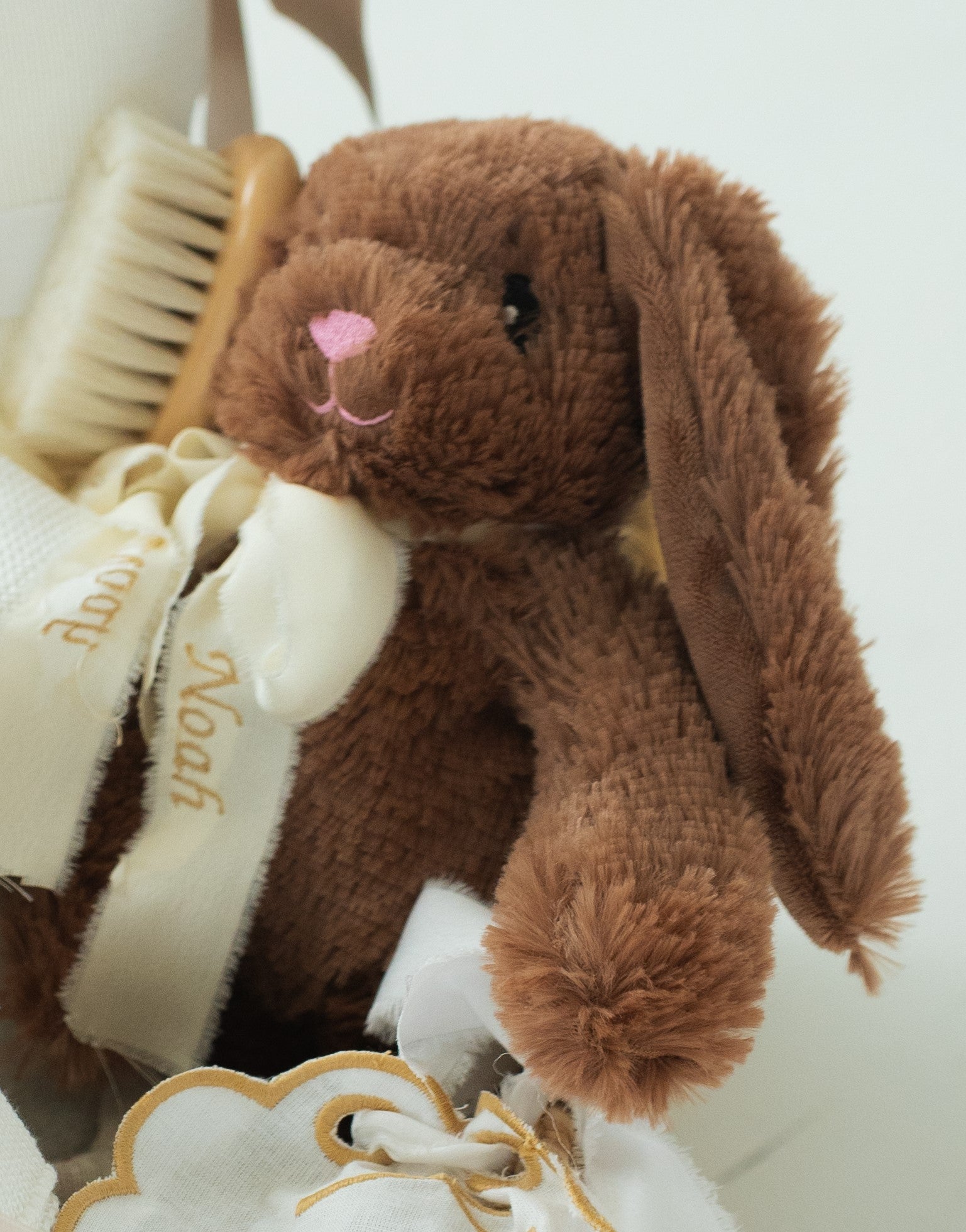 This adorable plush bunny is the perfect cuddle companion for your little one. Made from ultra-soft, baby-safe materials, it features charming pastel-colored ears and a sweet expression that makes it an ideal gift for newborns and toddlers. Perfect for snuggles, nursery decor, or as part of a baby shower gift set.