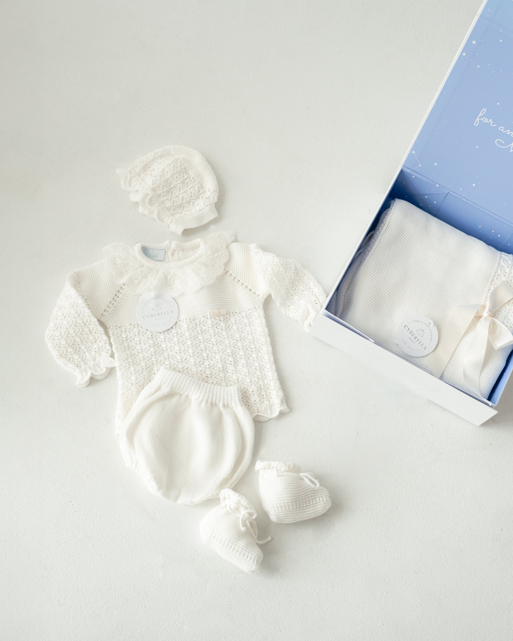 - Coordinated knit booties to keep tiny toes warm.