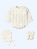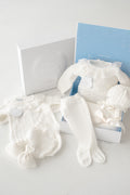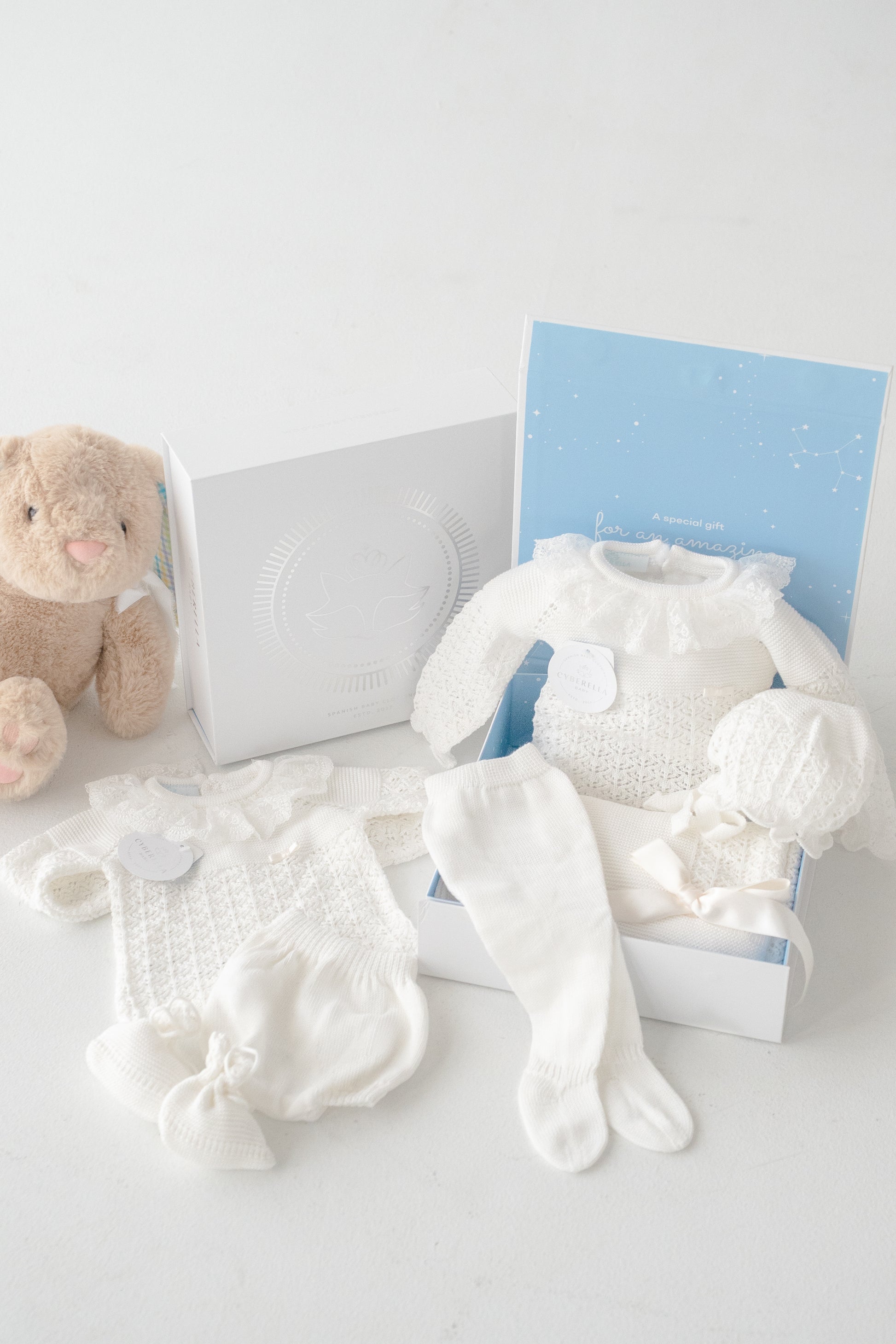 Wrap your little one in timeless elegance with our handcrafted 7-piece baby set, made in Spain from the softest cotton knit in a delicate ivory shade.
