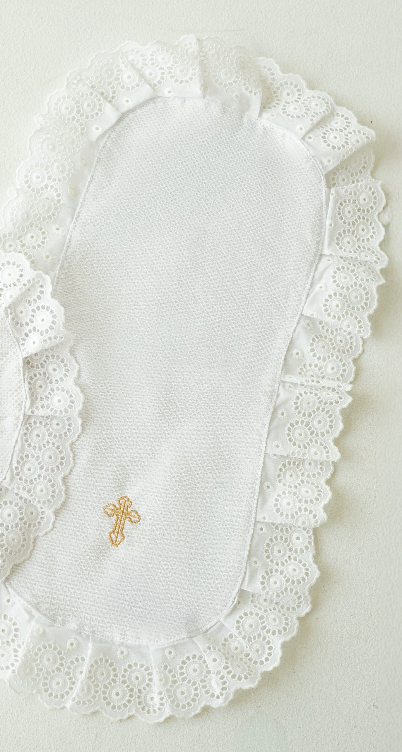 This refined white burp cloth adds a sacred touch to your baby’s baptism or christening ceremony. Crafted in Spain, it features soft textured fabric trimmed with delicate eyelet lace and is finished with an embroidered gold cross. Elegant yet practical, it's designed to gently protect both baby and caregiver during special moments.