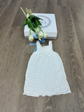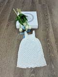 Sweet and delicate, this white knit romper is a timeless piece for your baby girl’s wardrobe. Featuring two charming mini bows on the front, it adds a subtle touch of elegance while keeping your little one cozy and comfortable. Perfect for special occasions or everyday style.